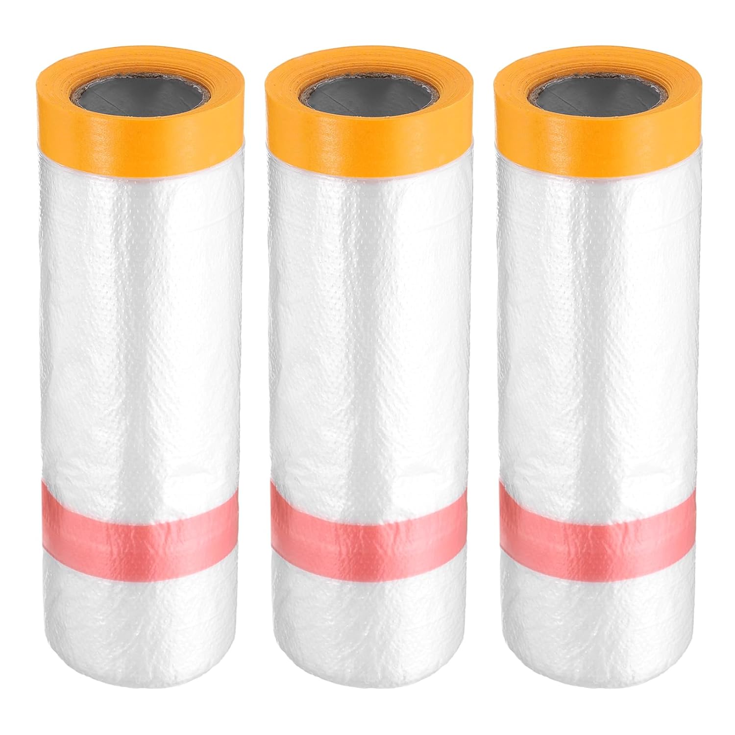 HARFINGTON 3 Rolls Pre-Taped Masking Film 43.3" x32.8ft Double Adhesive Tape and Drape Painters Plastic Drop Cloth Film with Tape Plastic Sheeting for Automotive Painting Covering