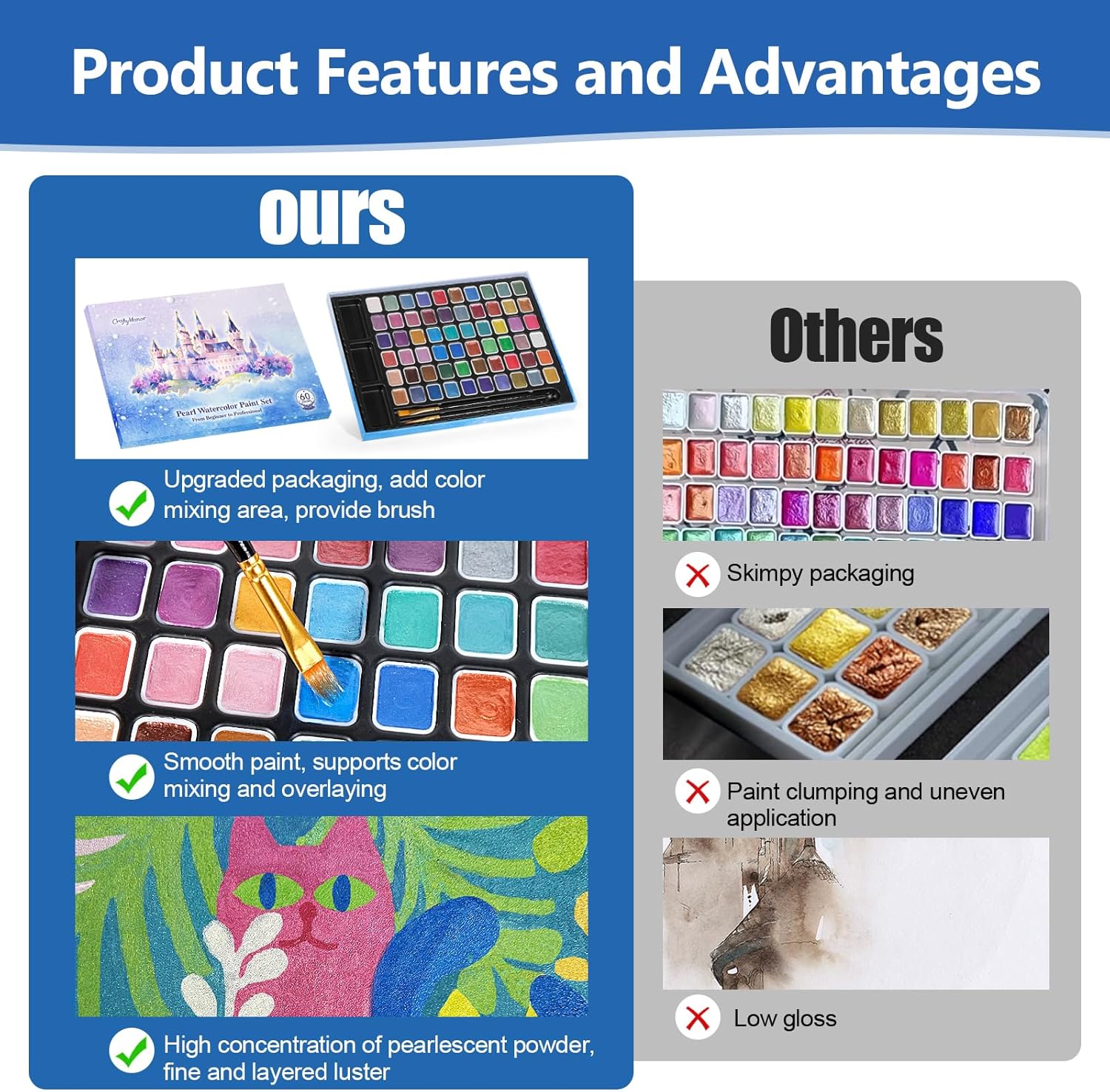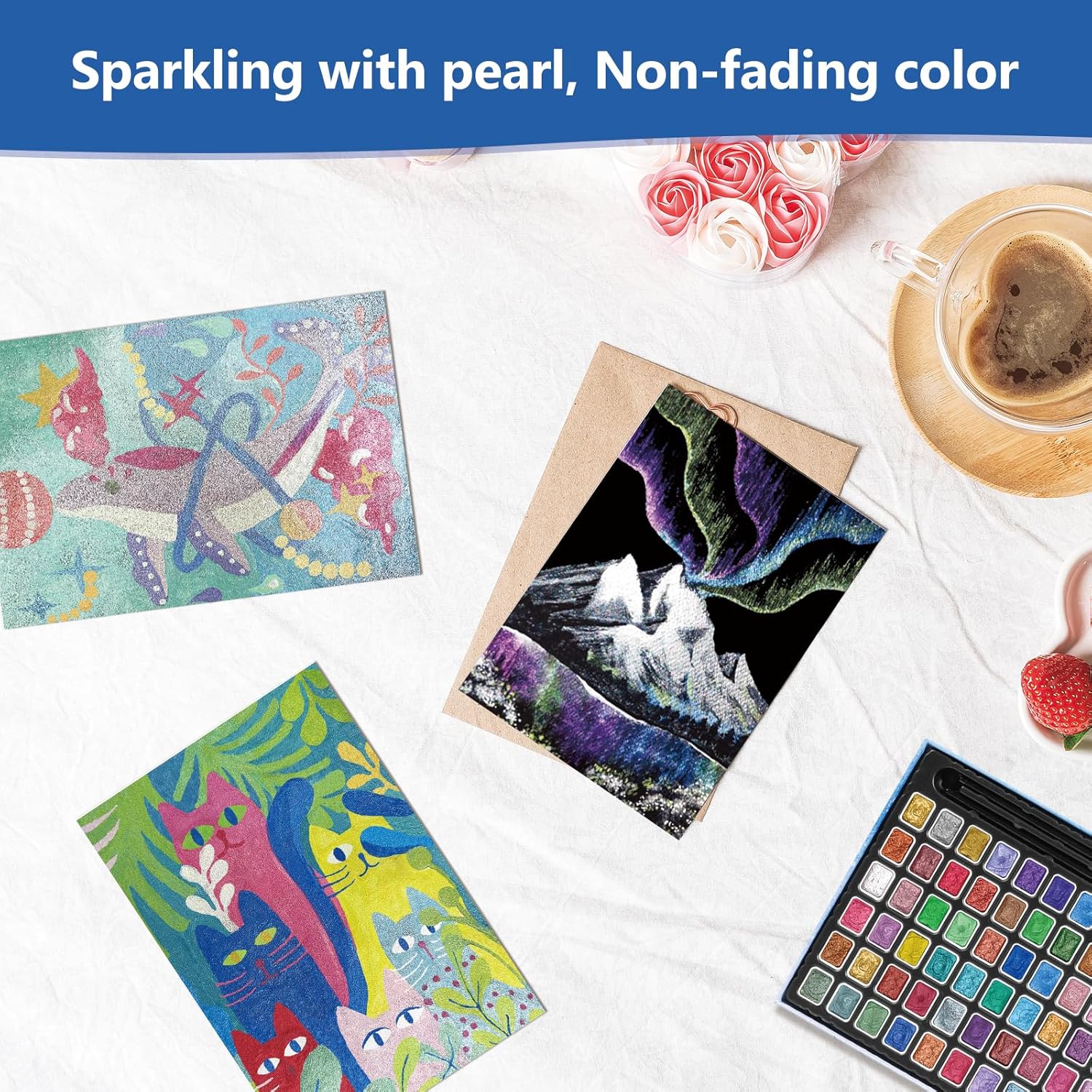 - 【Smooth Strokes, No Powder Off】Our watercolors paint set are extremely durability. Glitter watercolor remain highly stable, drying without crumbling or fading, making the watercolor painting shine forever. The fine powder texture makes the strokes of the pearl paint smooth and resists clumping