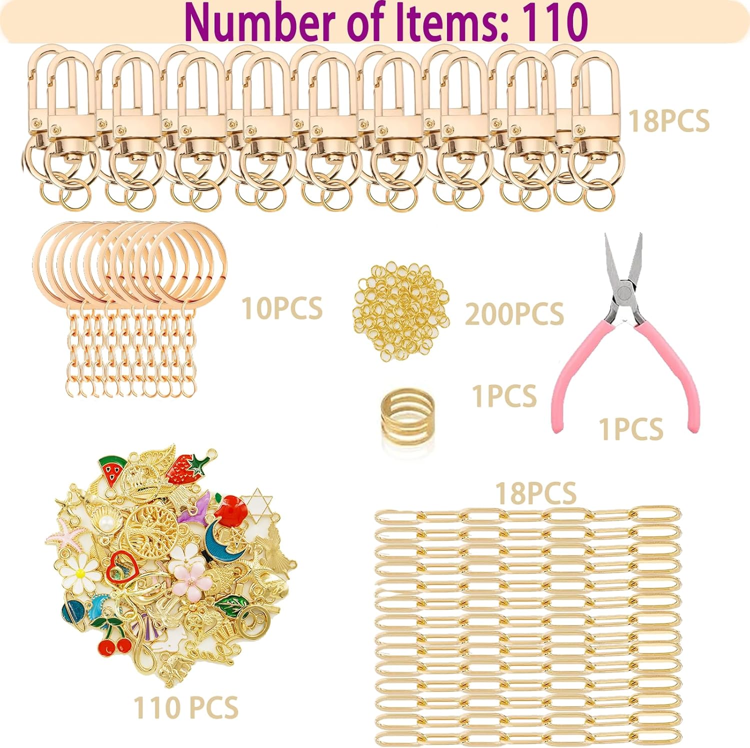 - COMPLETE KIT: Contains all essential supplies for making beautiful gold charm keychains including 110 charms, 18 keychain clips, 10 short keychain,200 jump rings, 18 extender chains, 1 needle nose pliers and 1 jump ring tool opener