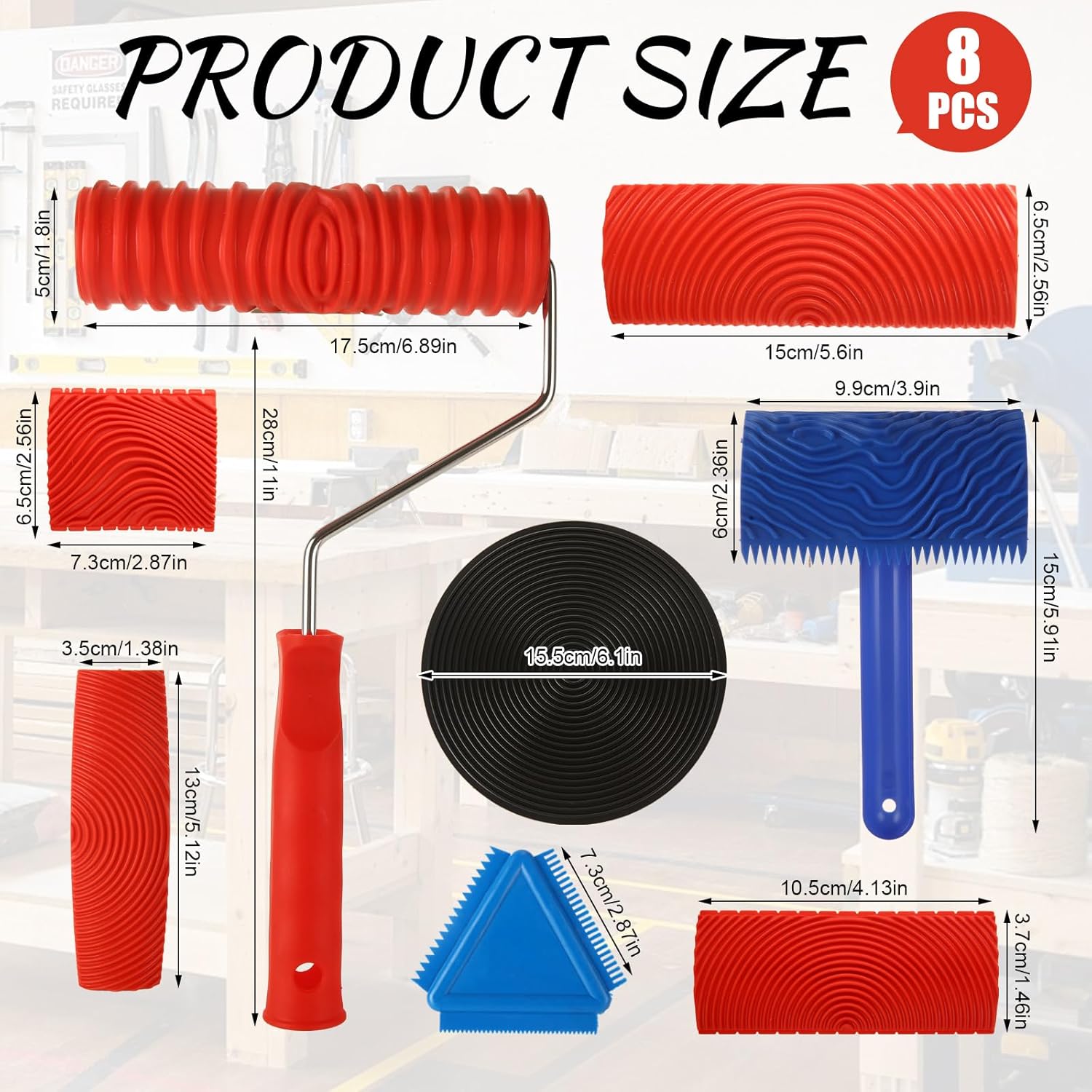 8 PCS Wood Grain Tool Set, 7" Textured Pattern Roller with Handle, Rubber Wood Graining Tool for Wall Floor Furniture Wood Pattern Art Decoration
