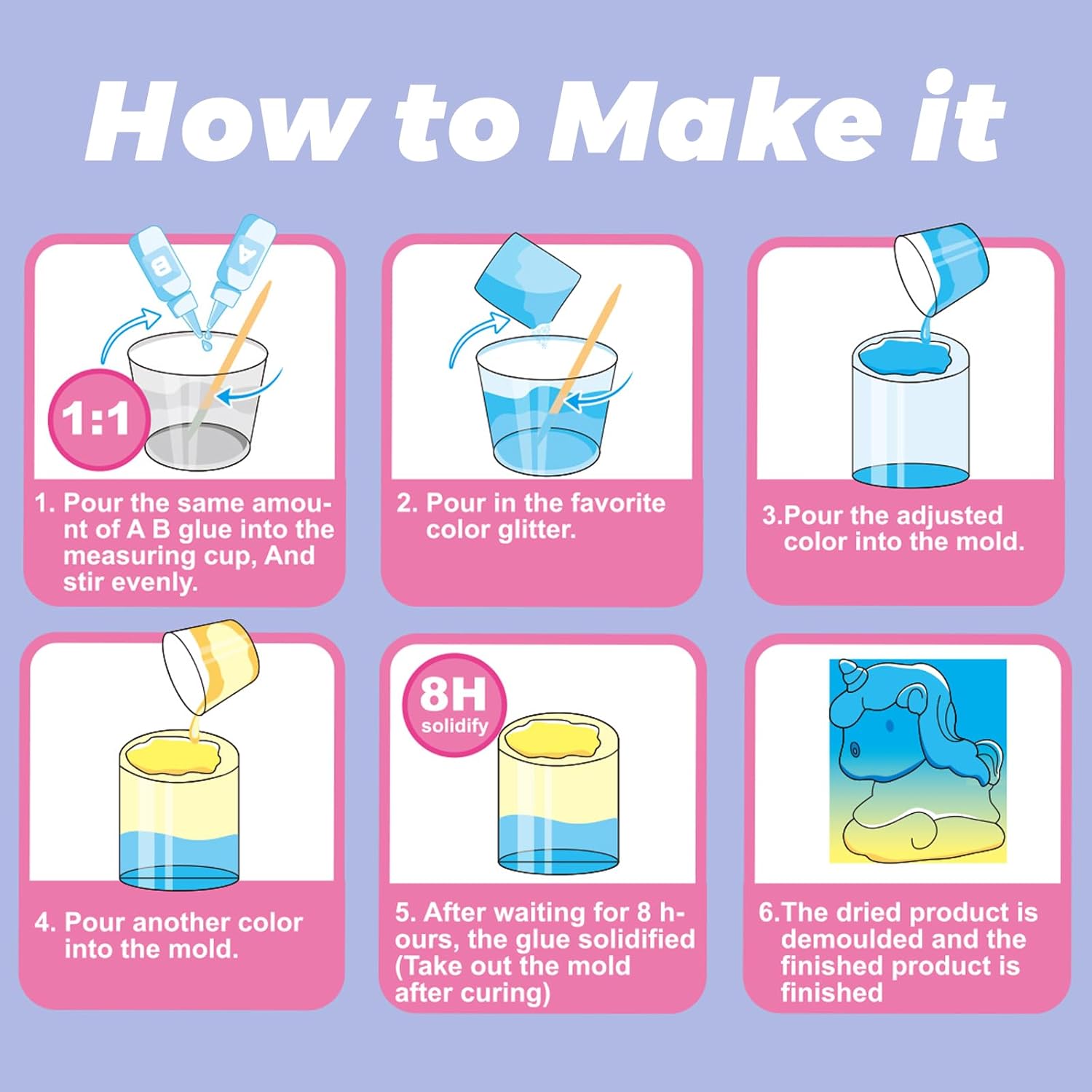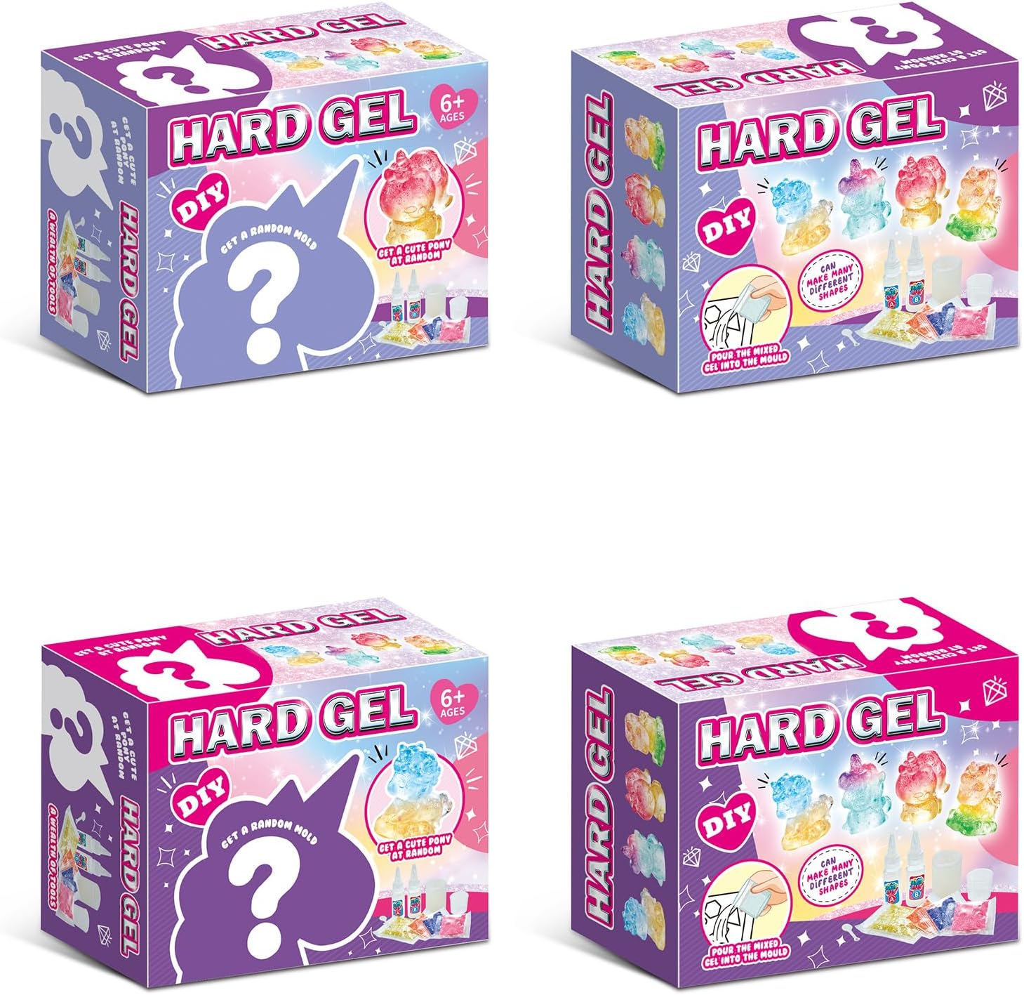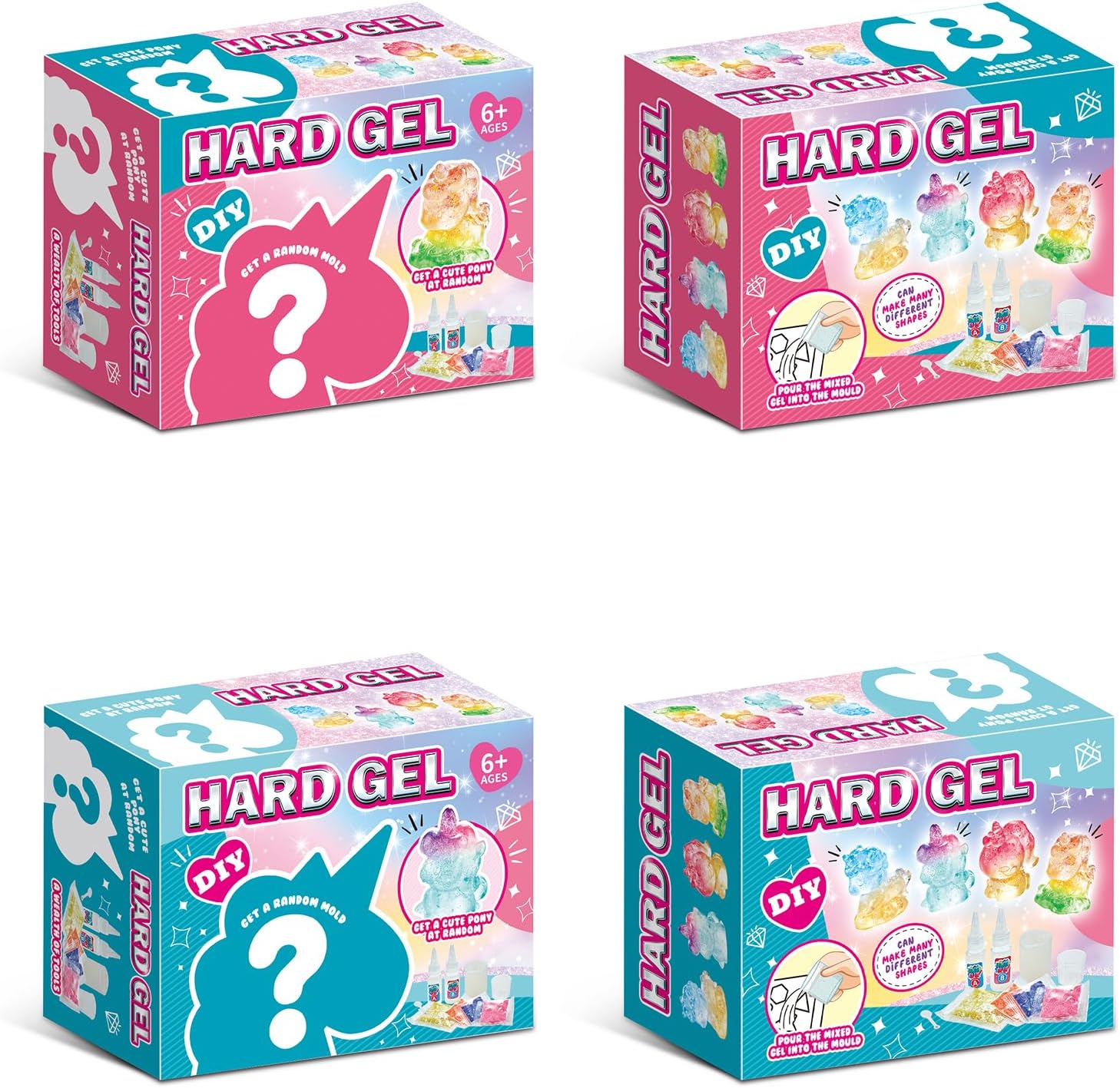 - Hard Gel Blind Box: Complete diy starter kit including 4 separated glitter packs, 20ml dual measuring cups and step by step comic instructions, mess-free crafting experience. There are 4 style unicorns in the box. Create custom unicorns in 8 hours!