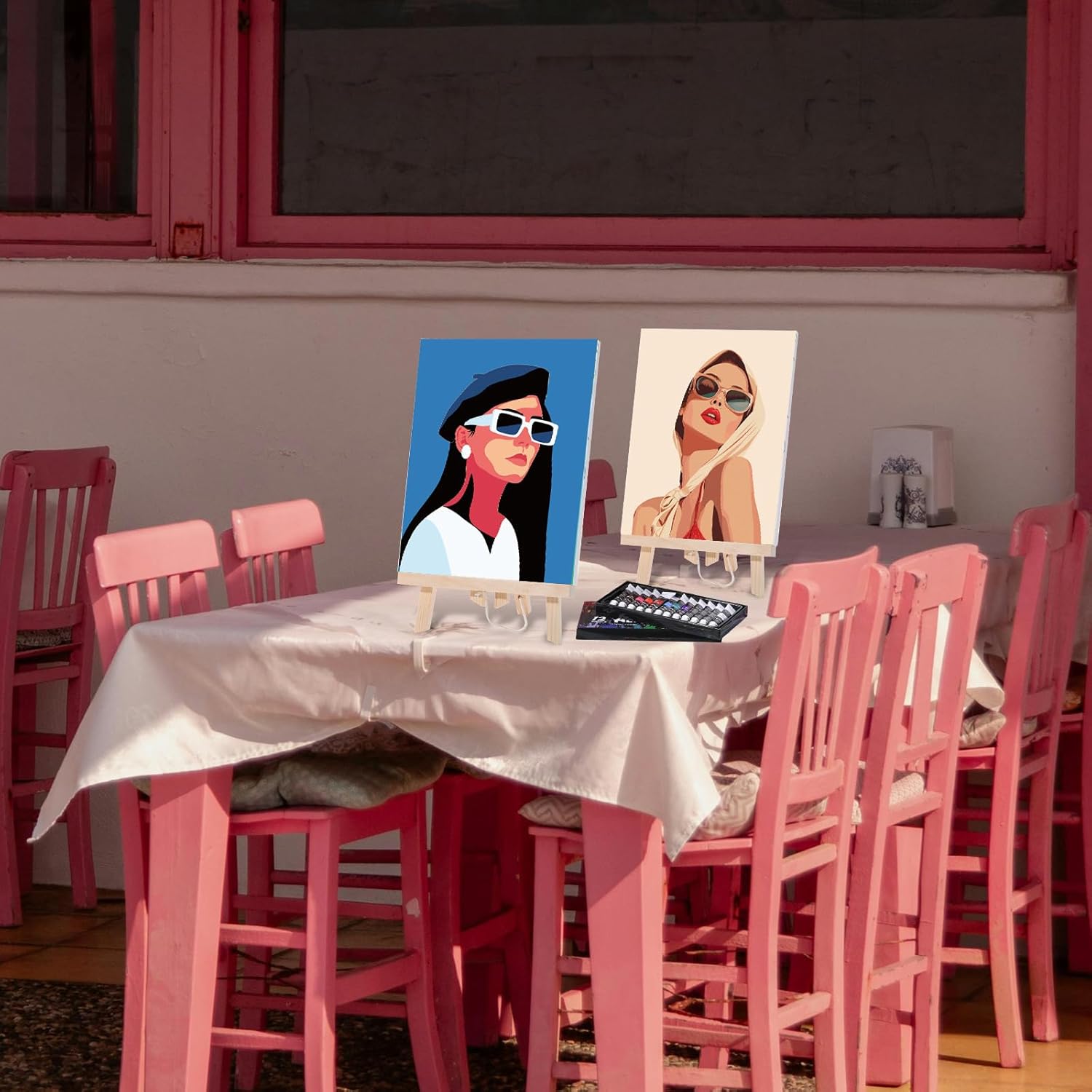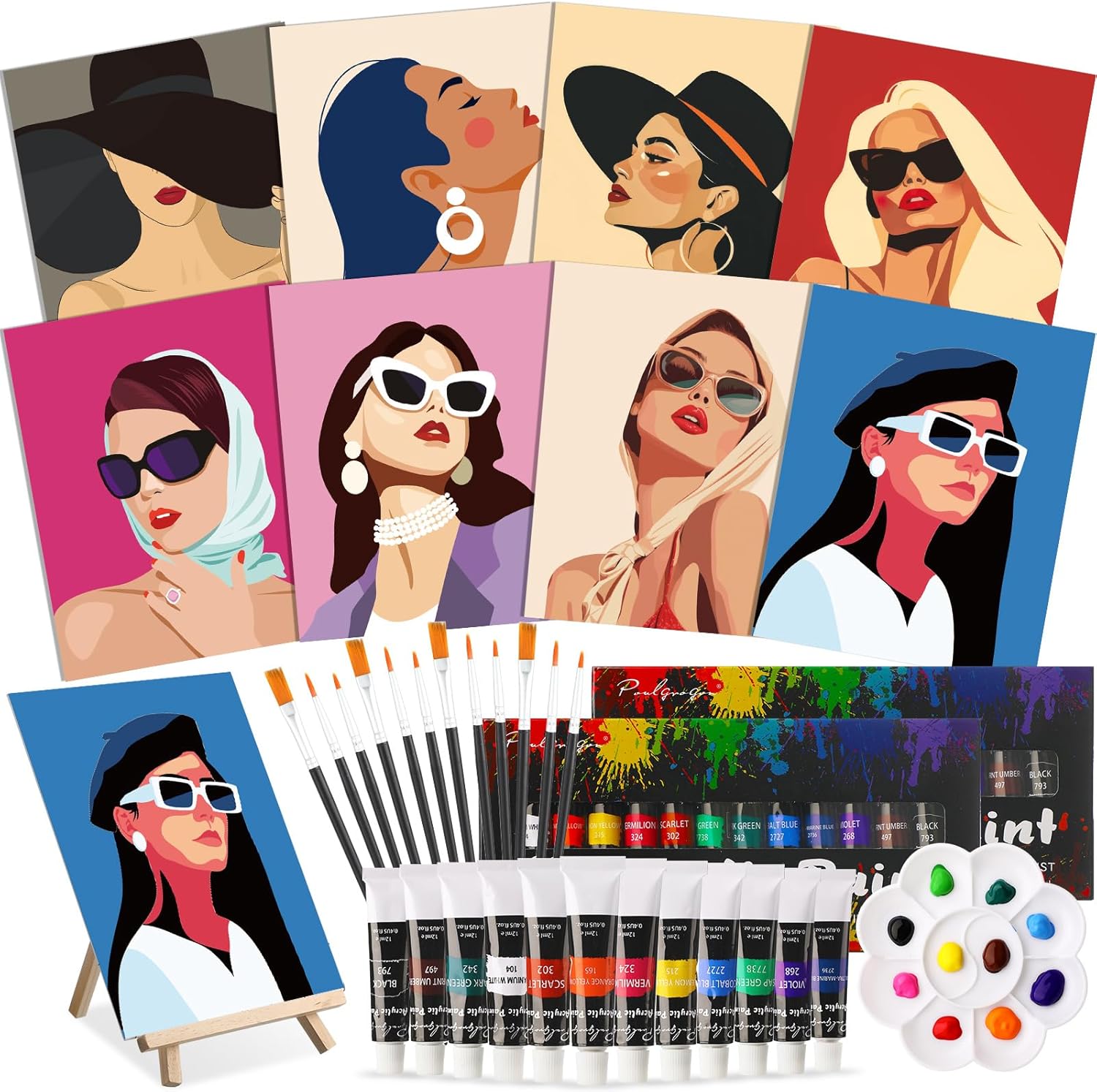 - Extensive Pre Printed Canvases Set: a total of 8 pre printed canvas, with 8 different well designed patterns; Comes with 12 reference color matching cards corresponding to the pattern; 2 packs of acrylic paint set, each pack contain 12 different colors; 2 pcs wooden easel holders; 8 packs of paintbrushes, 3 per pack, including 3 different pen and 8 pcs of white paint trays