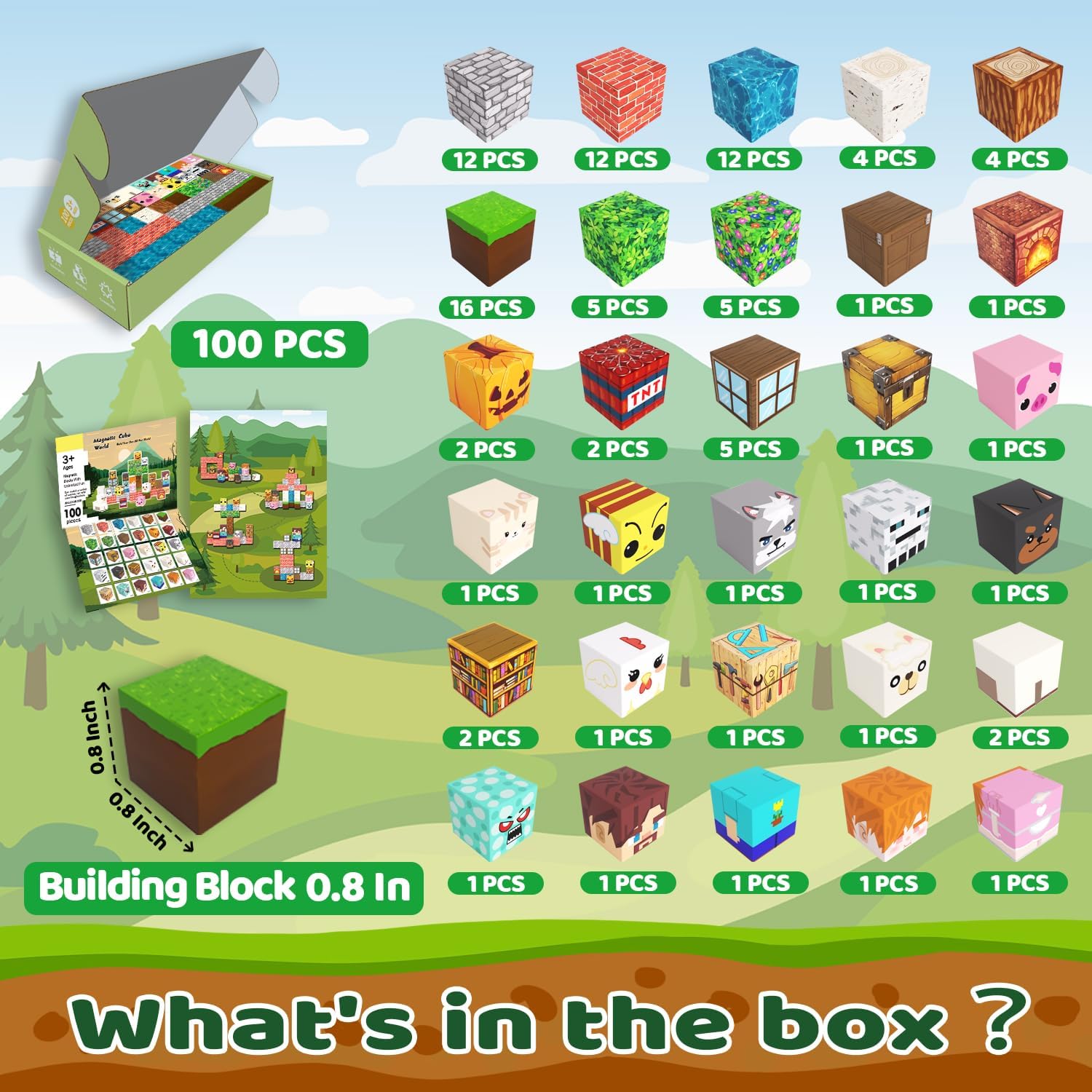 - 【Magnetic Blocks for Kids】This set includes 100pcs 0.8inch magnetic blocks in 30 distinct designs, plus a creative storybook packed with step-by-step building patterns. It’s the perfect screen-free activity to spark imagination, kids can follow the illustrated guides or design their own structures from scratch.