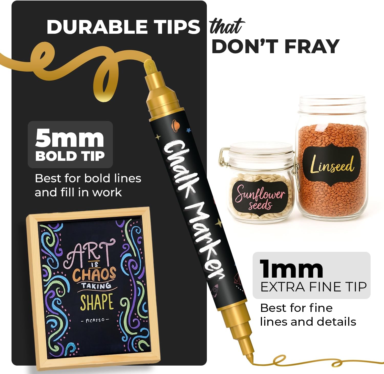 - Dual Tip Chalk Markers - Switch between thin 1mm extra fine tip for precise details, small text, and intricate designs, and 5mm bold tip for filling backgrounds, large lettering, and broad coverage. Tight-fitting caps prevent drying when stored.