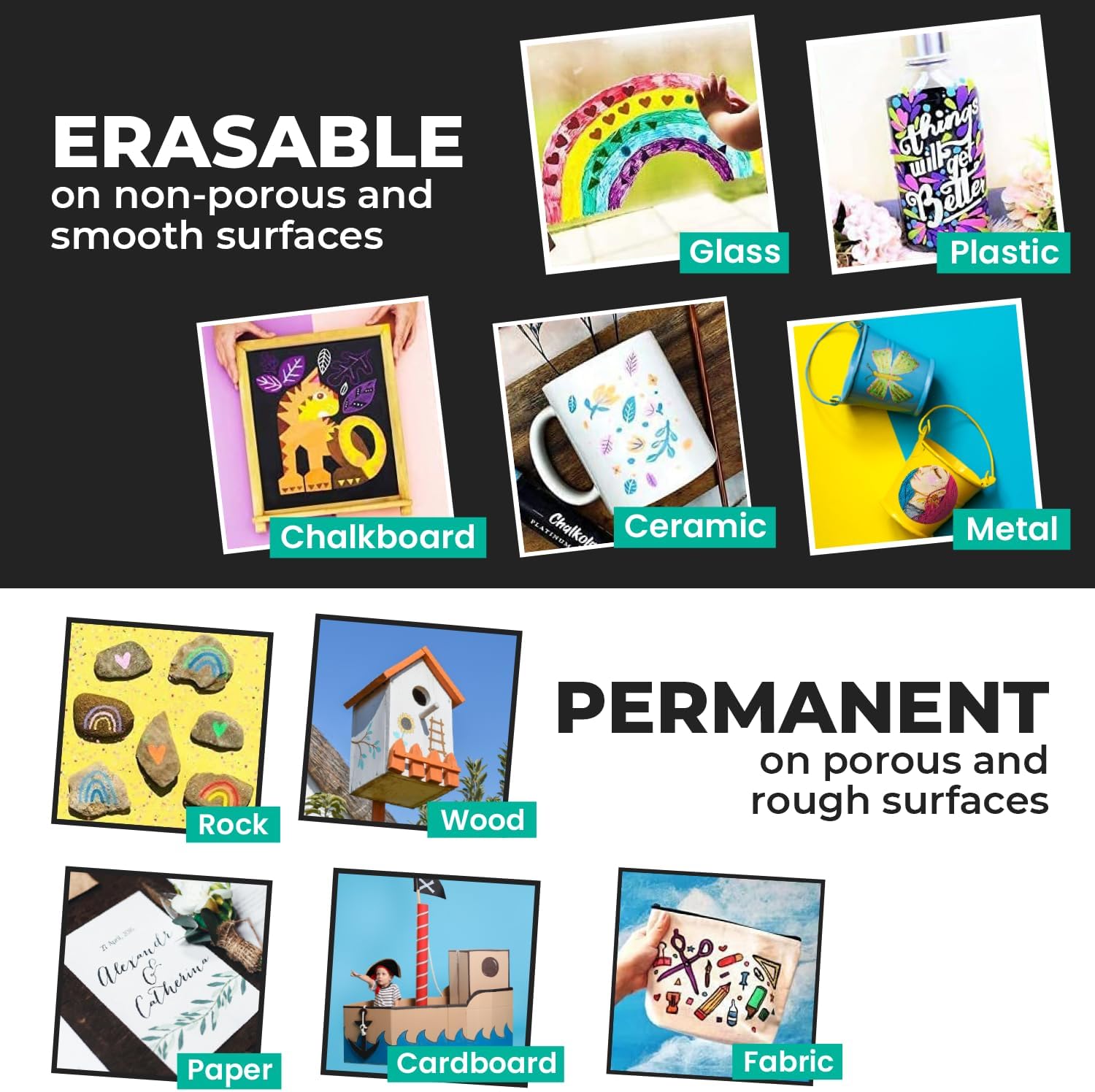 - Erasable Chalk Board Marker Pens - These liquid chalk pens flow smoothly on any non-porous surface. Simply wipe clean with damp cloth on chalkboards, glass, ceramic, plastic and metal (dry & wet erase), becomes permanent on porous surfaces like wood.