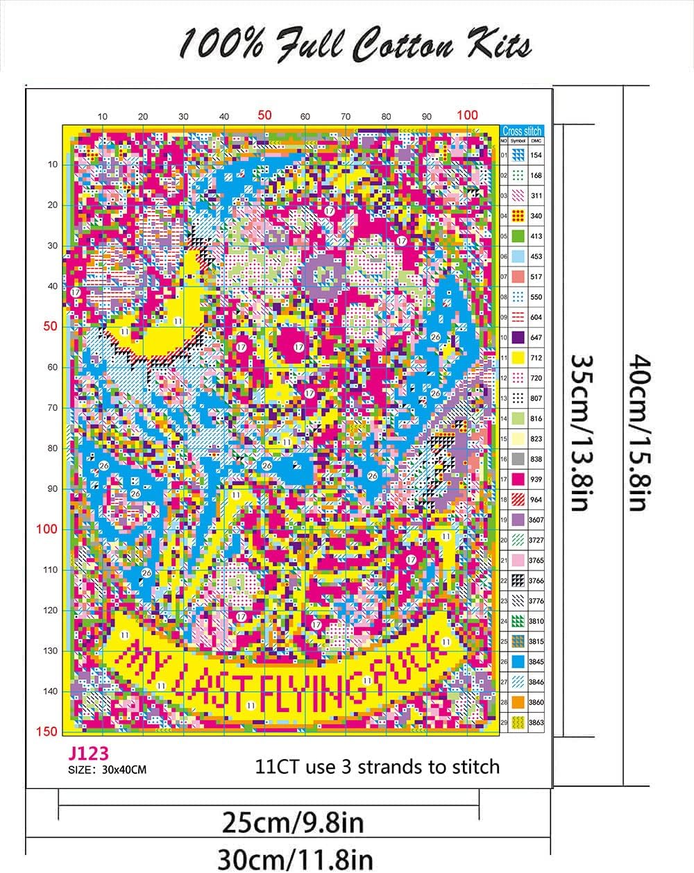- Package:11.8*15.8inch, 2pc cross stitch needles, enough thread already sorted, English instructions,cross stitch patterns instructions,and 11CT Pre-printed stamped cross stitch fabric cloth. (11CT,without frame)
