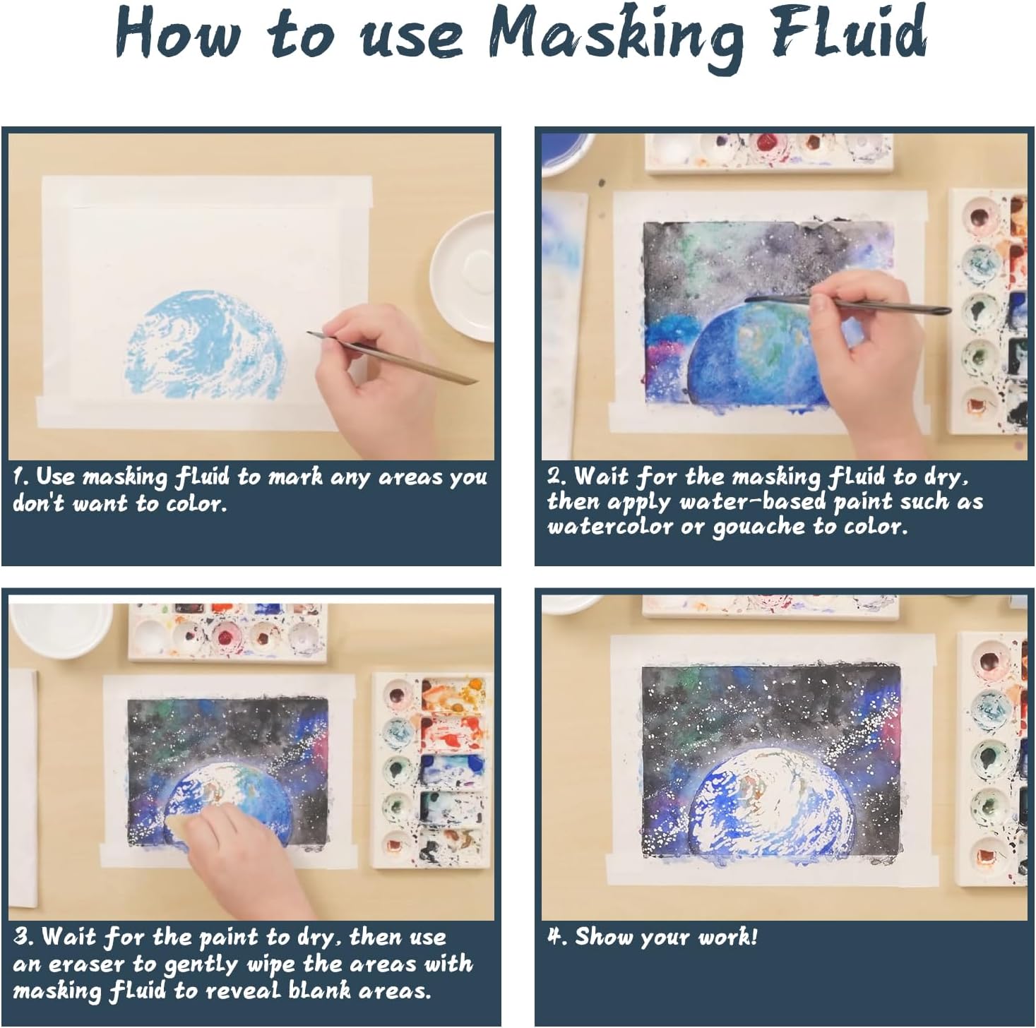 - Masking Fluid for Watercolor Painting: Our natural latex masking fluid is an easy-to-peel formula that can be applied to artwork to mask areas that require protection from paint and ink splatters. Art masking fluid apply prior to applying colors on your paper, canvas, wood, or other base
