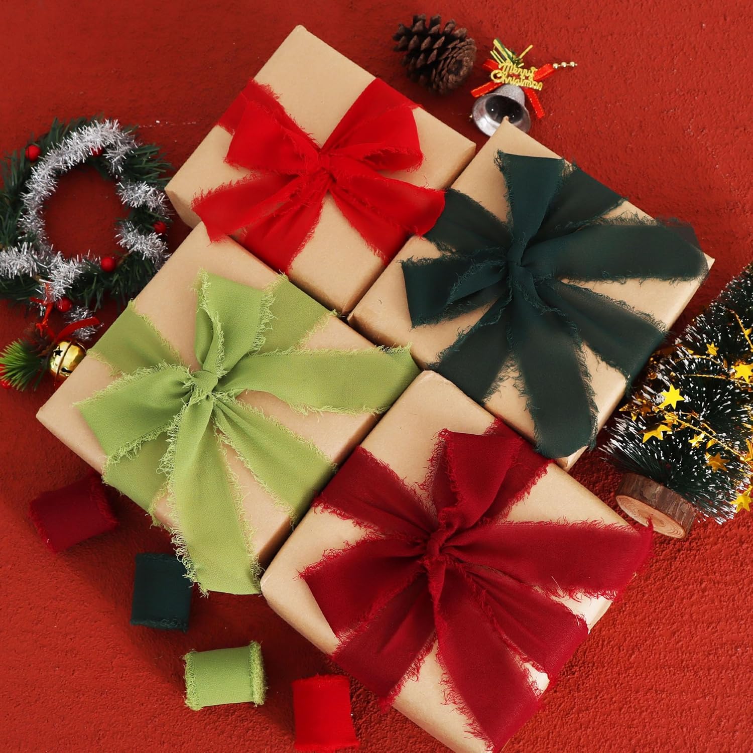 TONIFUL 4 Rolls Silk Chiffon Ribbon 1-1/2 Inch x 22 Yards, Red and Green Handmade Fringe Silk Ribbon Set for Gift Wrapping Flowral Bouquets Crafts Halloween Christmas Wreath Tree and Party Decoration