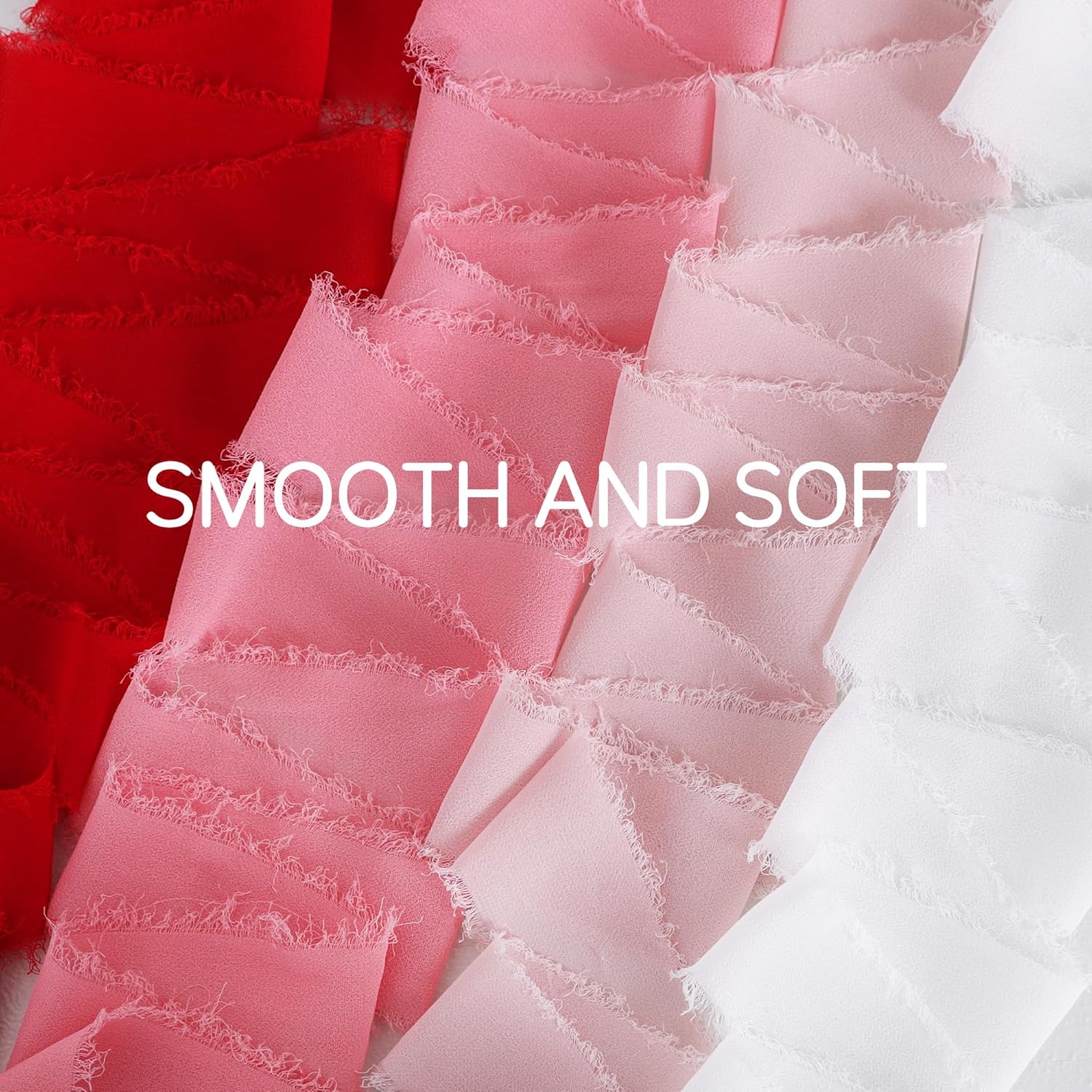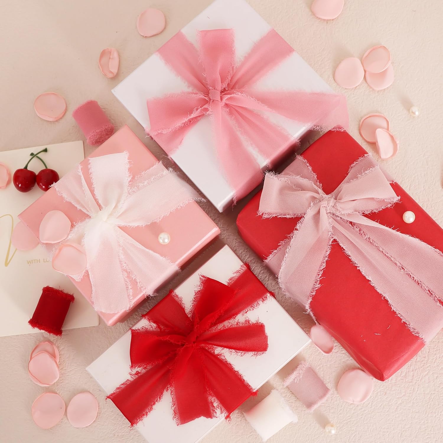 TONIFUL 4 Rolls Silk Chiffon Ribbon 1-1/2 Inch x 22 Yards,Red Pink and White Handmade Fringe Silk Ribbon Set for Gift Wrapping Bridal Bouquets Crafts Wedding Christmas Valentines Decoration