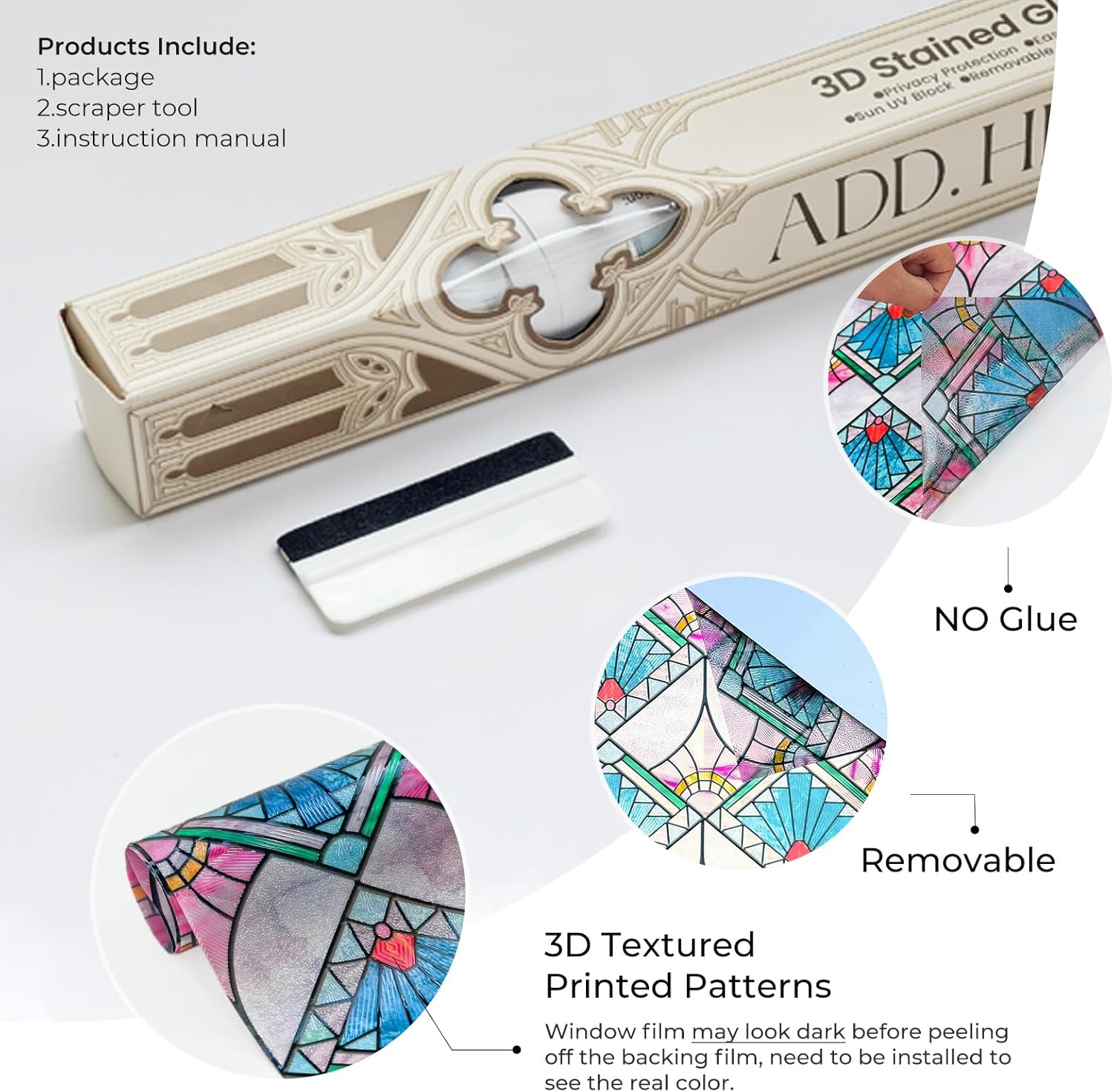 - Easy Installation and Adhesive-Free - Our stain glass film installs easily, no glue needed. Just measure, cut, and apply with water on clean glass. It's residue-free for easy repositioning or removal whenever you want a new look.