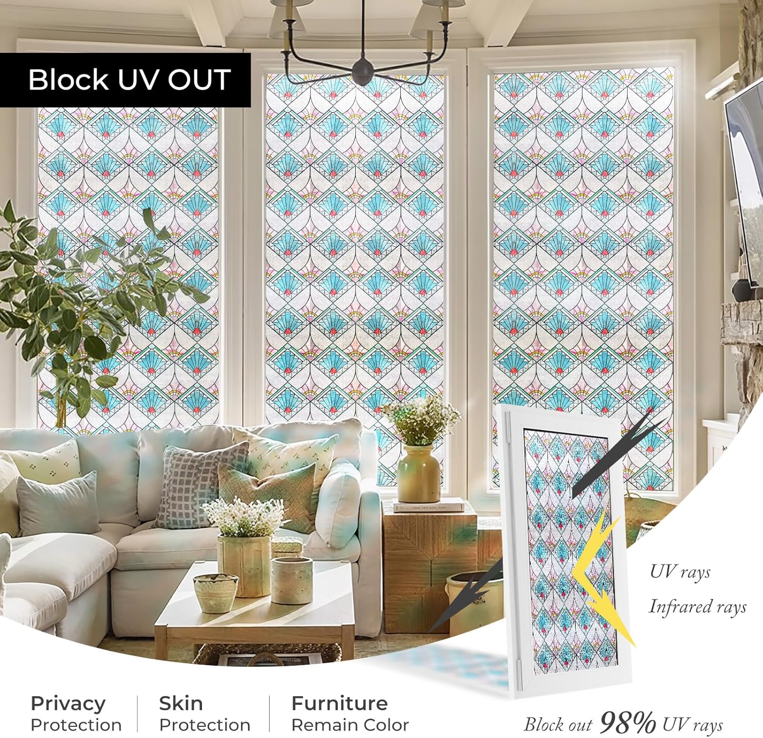 - UV Protection and Energy Efficiency - Our stained glass window film shields interiors from UV rays, preserving furniture and decor. It also enhances energy efficiency by balancing temps, keeping spaces cozy in all seasons.