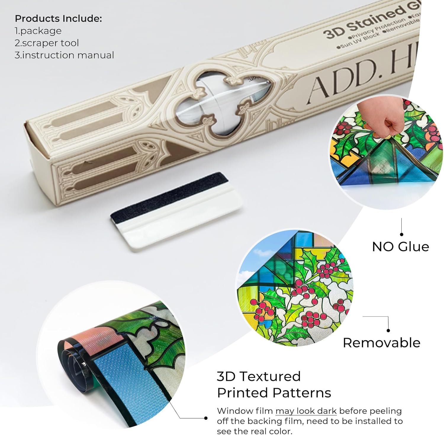 3D Stained Glass Window Film, Decorative Window Privacy Film for Bathroom,Front Door,Home, Sun Blocking Heat Control,Static Cling,23.6inch x 35.4inch Holly