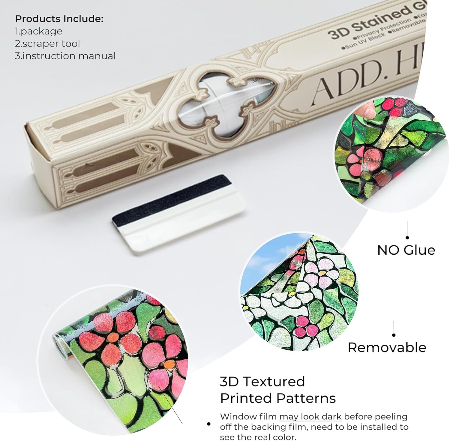 - Easy Installation and Adhesive-Free - Our stain glass film installs easily, no glue needed. Just measure, cut, and apply with water on clean glass. It's residue-free for easy repositioning or removal whenever you want a new look.