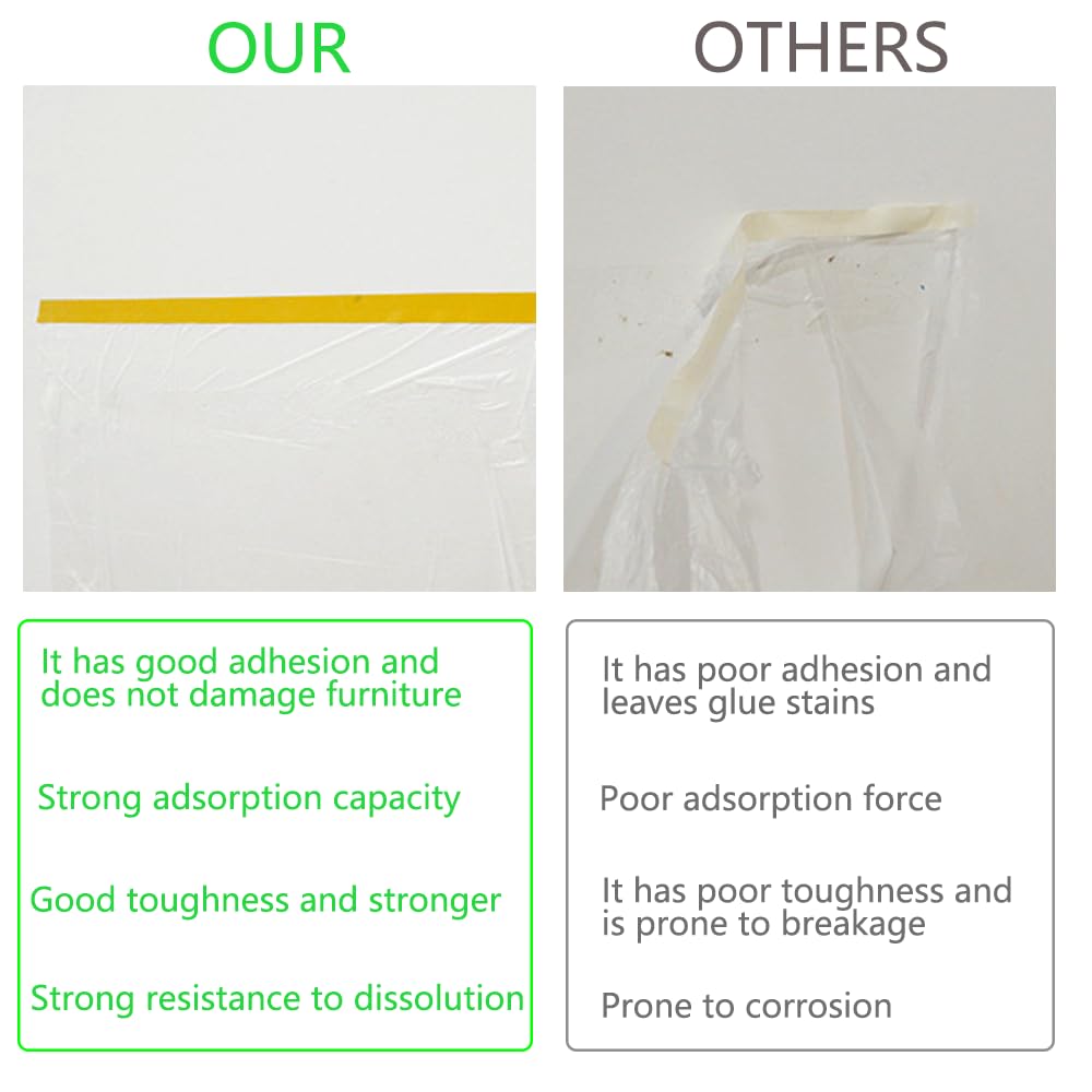 - 【Easy to use】The Plastic painting film is super easy to use, you just need to unroll the roll of masking film, put the tape side firmly in the right place, then cut it with scissors or tear it by hand, the plastic film will be electrostatically adsorbed and attached to the surface of the object.