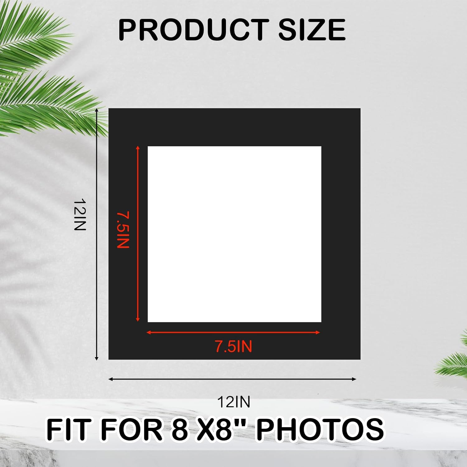 - 12x12 Black Picture Mats for 8x8 Photos: 15 pack black picture mats, the outer frame size of the photo frame mat is 12x12 inch / 305x305 mm, and the inner frame size is 7.5x7.5 inch / 190x190 mm, black picture mats 12x12, suitable for 8 x 8 photos.
