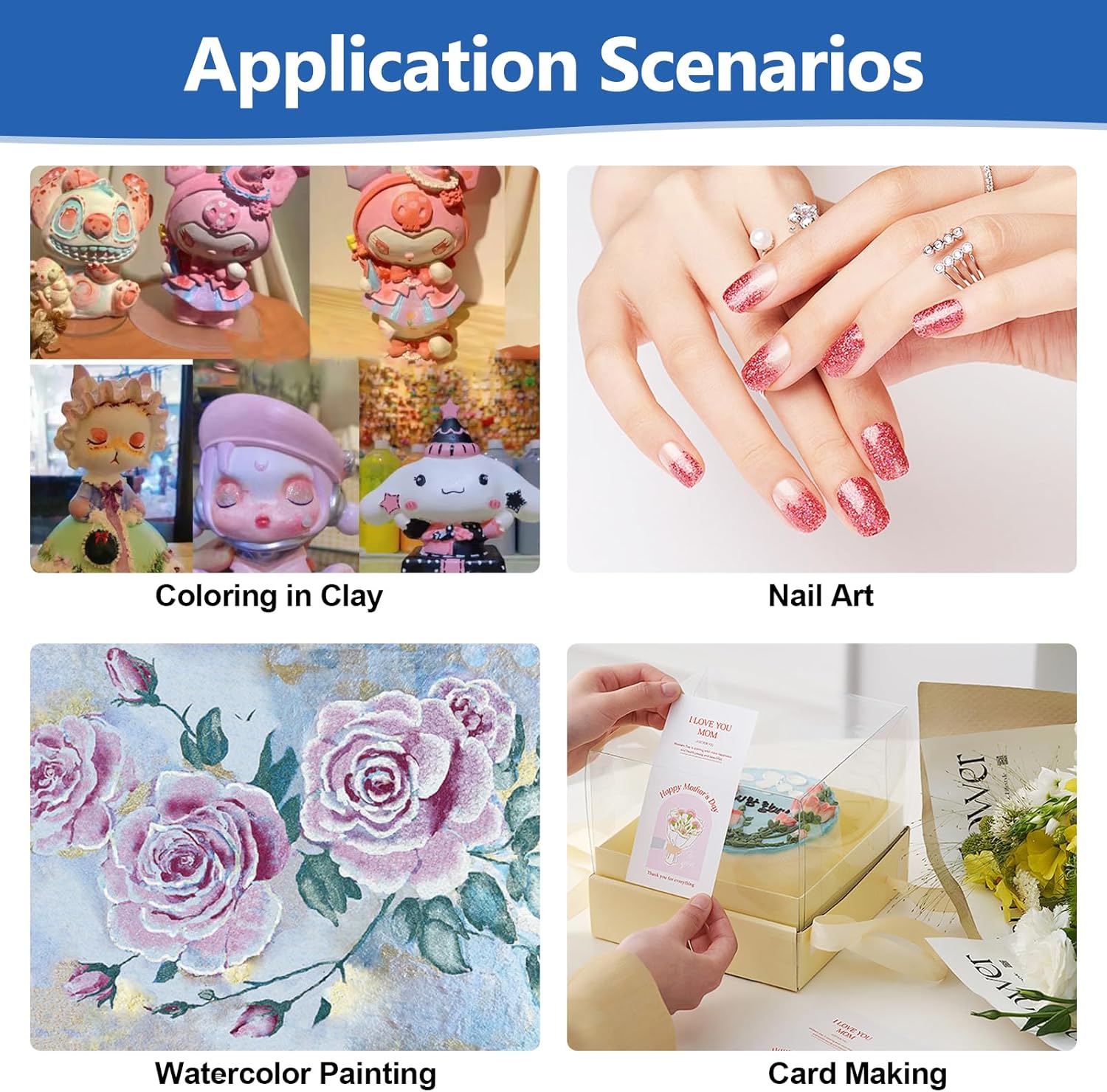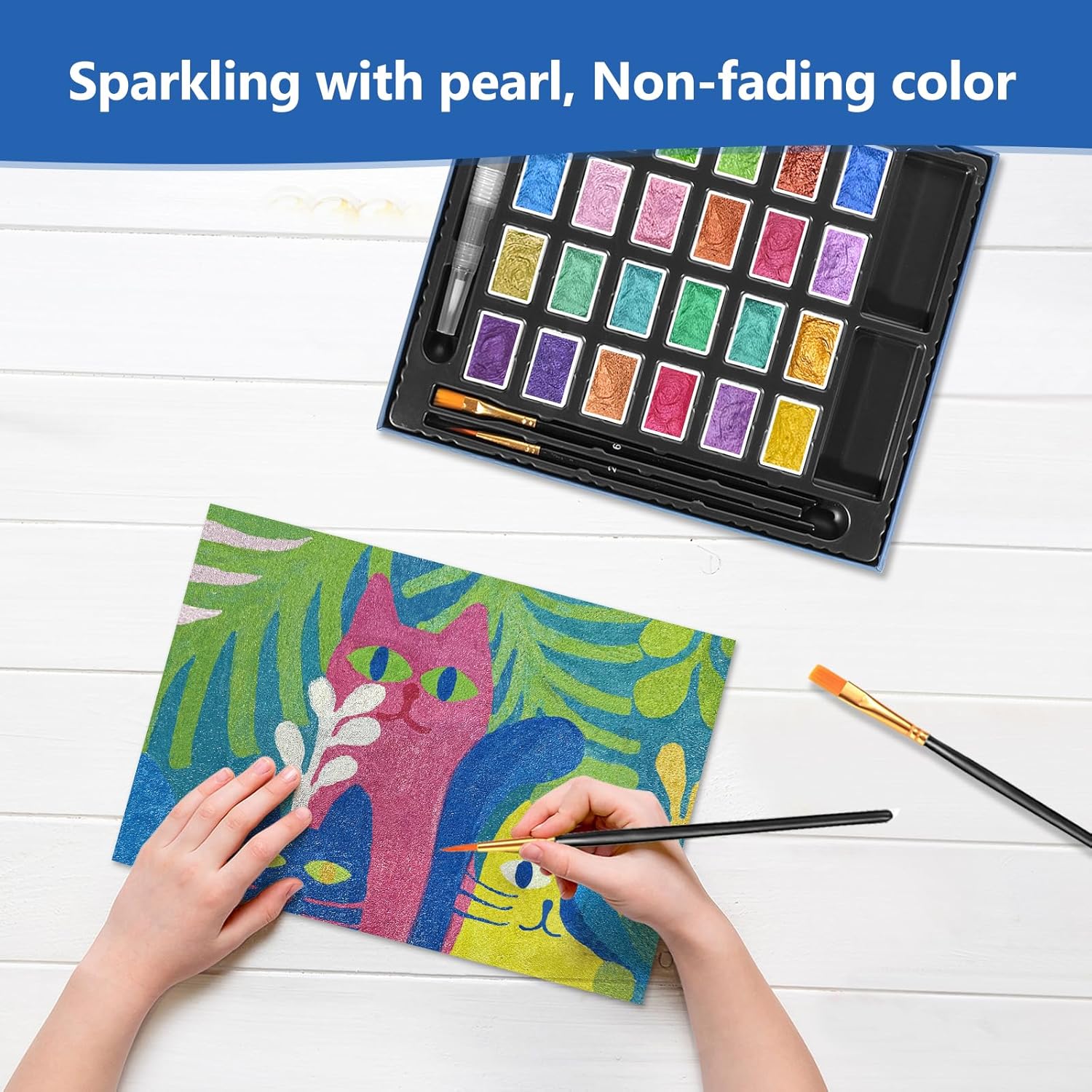 - 【Smooth Strokes, No Powder Off】Our watercolors paint set are extremely durability. Glitter watercolor remain highly stable, drying without crumbling or fading, making the watercolor painting shine forever. The fine powder texture makes the strokes of the pearl paint smooth and resists clumping