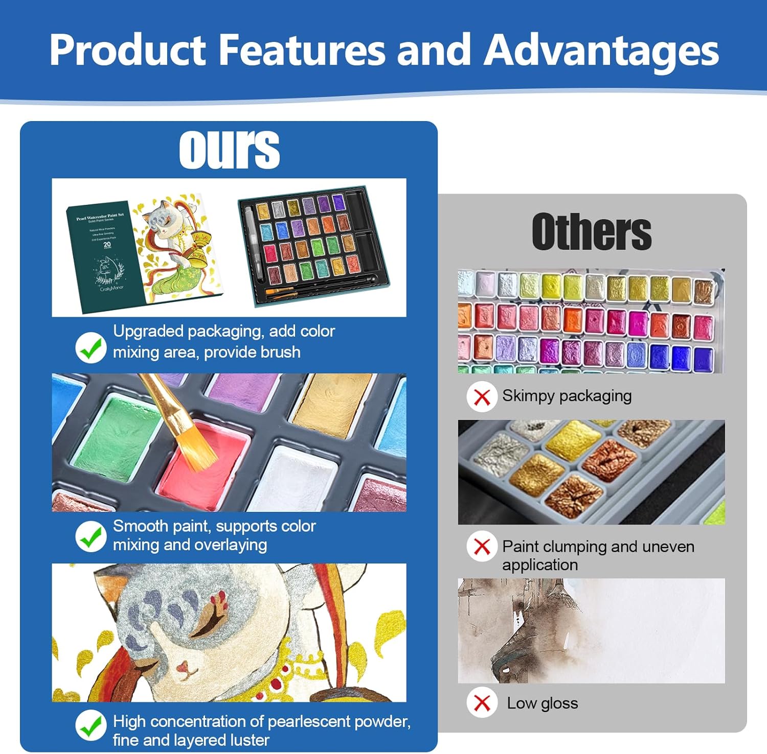 - 【Exceptional Shimmering Texture】CraftyManor pearlized water color paint sets for kids are formulated with premium, modified mica powder, resulting in a stunningly glossy finish. Free of acids and toxins, the watercolor sets are safe to use and will add a radiant touch to your art work
