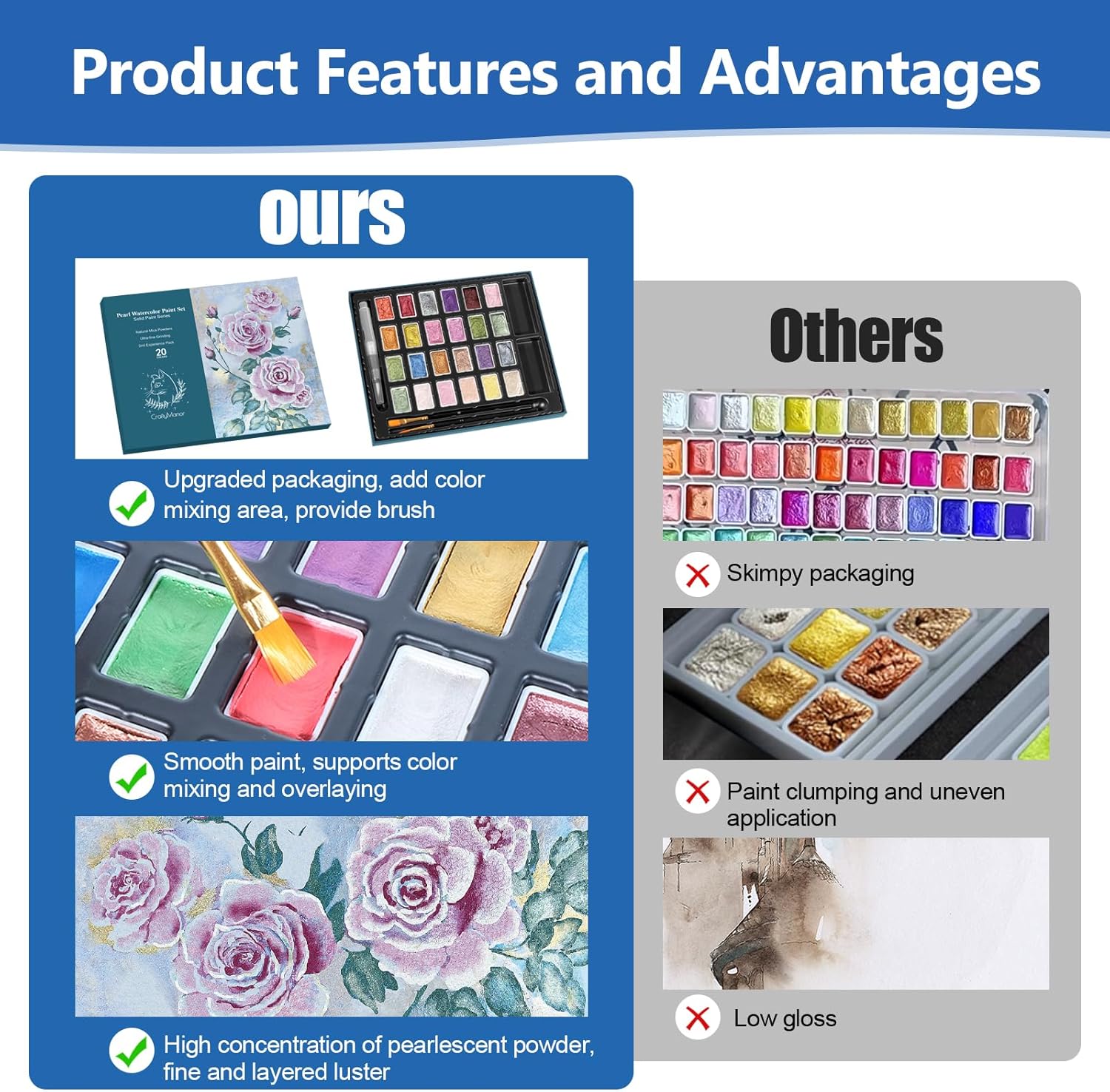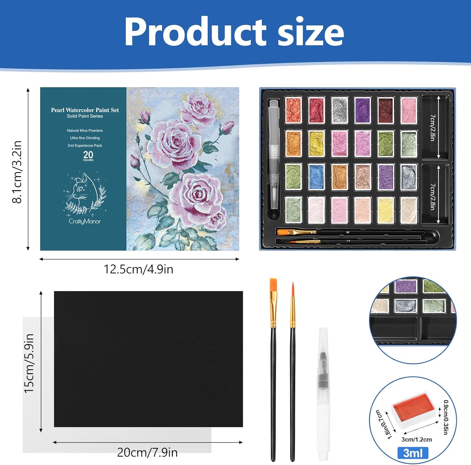 - 【Exceptional Shimmering Texture】CraftyManor pearlized water color paint sets for kids are formulated with premium, modified mica powder, resulting in a stunningly glossy finish. Free of acids and toxins, the watercolor sets are safe to use and will add a radiant touch to your art work