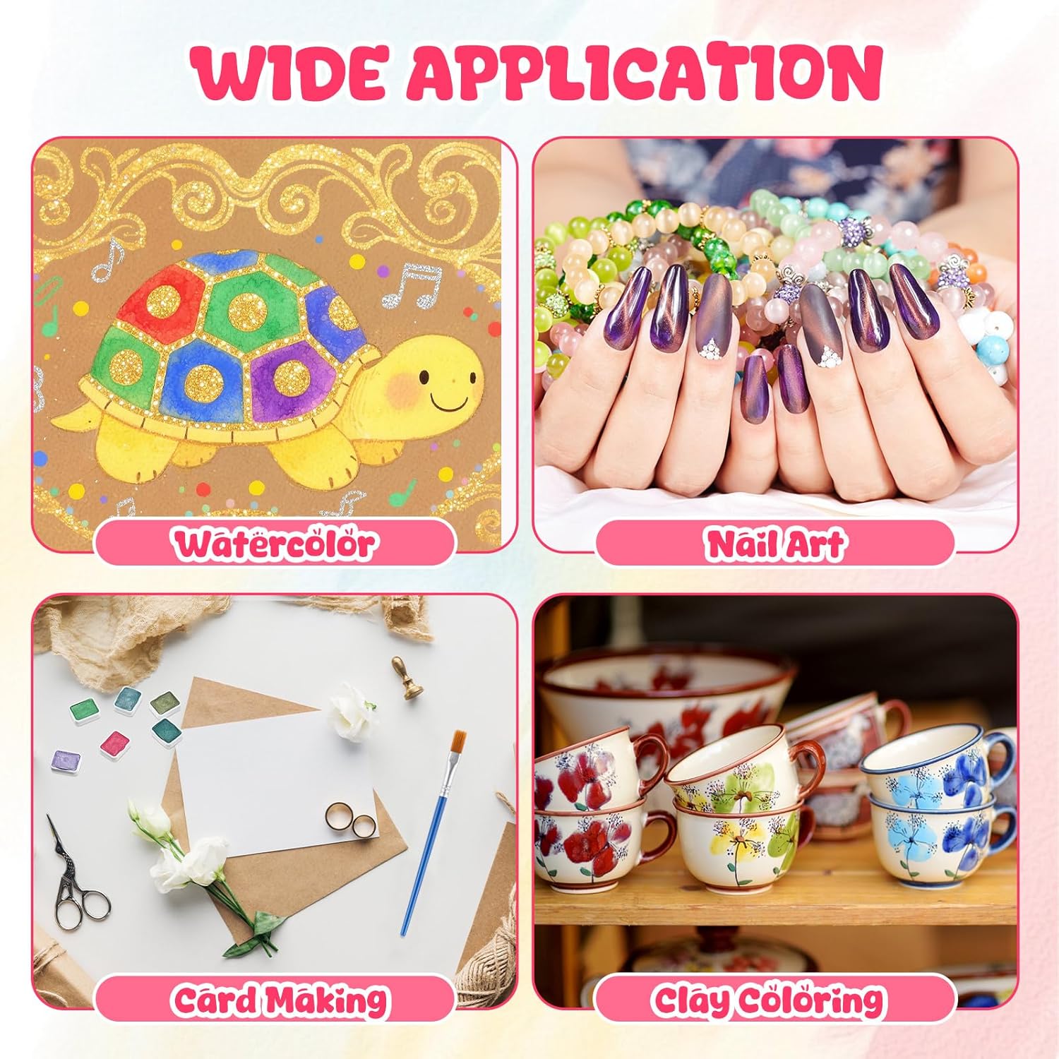 - Smooth Strokes and Versatile Finish: experience the fine powder quality of our glitter watercolor paint that ensure smooth brushwork without clumping; Once dried, they adhere firmly to various paper types; Enjoy rich color and luster, delivering a remarkable artistic experience