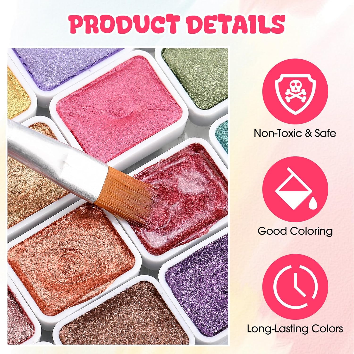 - Compact Creativity Unleashed: discover your inner artist with our compact metallic watercolor paint set, featuring 12 sets(240 pcs) mini metallic paints, each with a brush; Ideal for sparking creativity, these friendly paints add vibrant shimmer to your artwork while ensuring safety