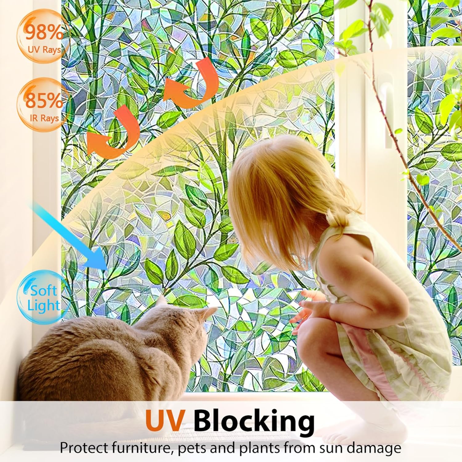 - UV BLOCKING & GLARE CONTROL: Rainbow window privacy film can protect your family from harmful UV rays by reducing up to 98% of UV rays, reducing fading and ageing of interior furniture, say goodbye to harmful UV rays and harsh glare. Enjoy natural light and make your life more pleasant