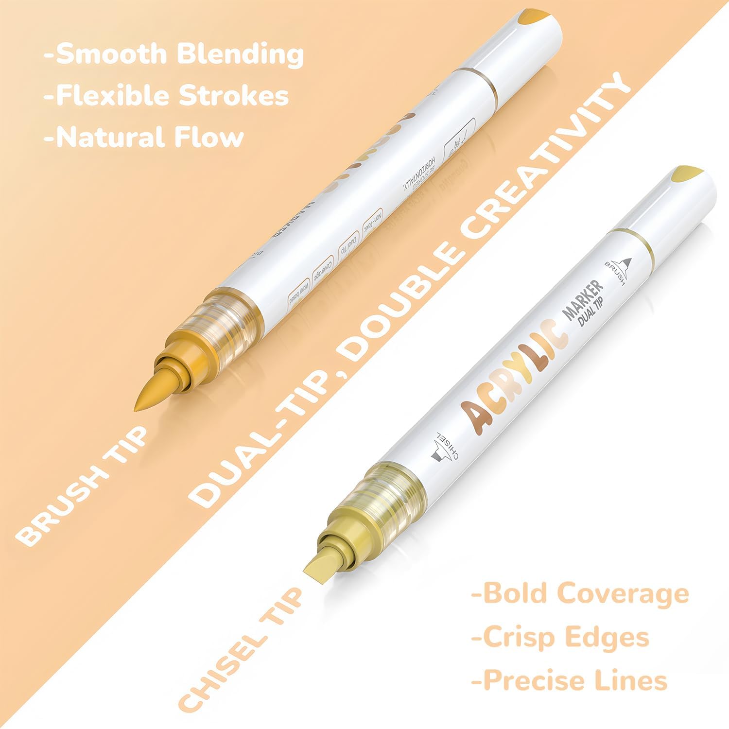 - 【DUAL TIP DESIGN】Brush tip flows with smooth blending and flexible strokes; chisel tip delivers bold coverage and crisp edges.