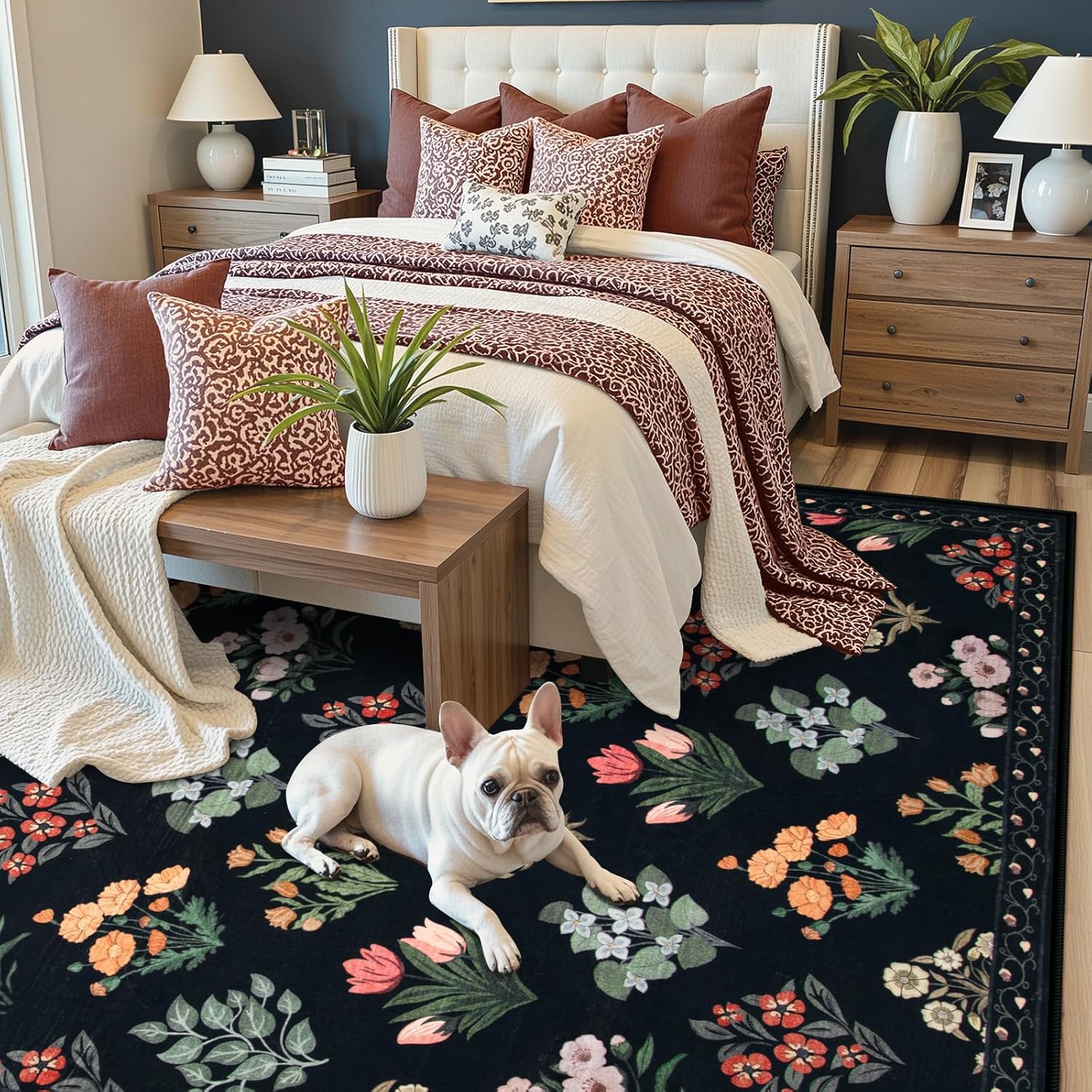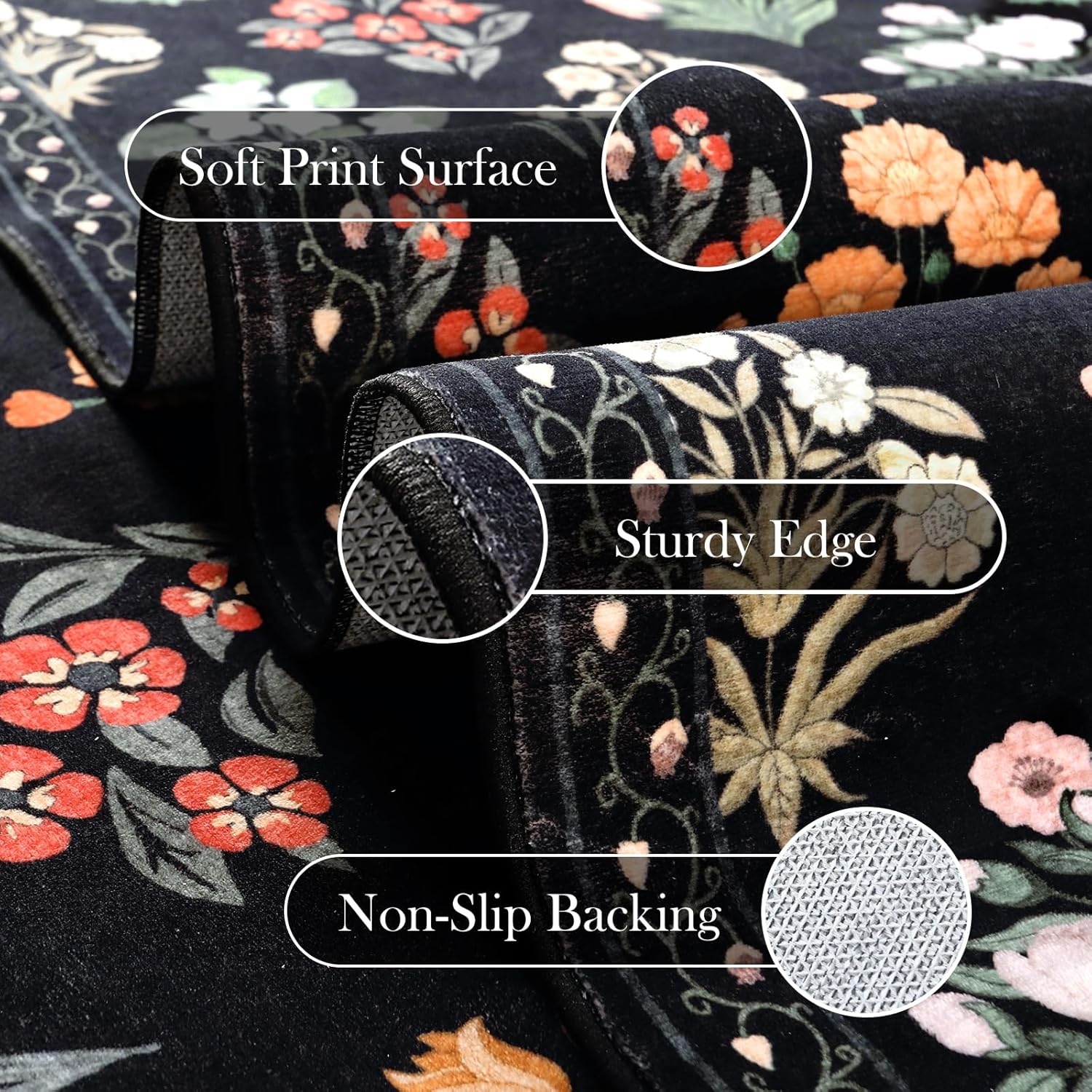Wonnitar Floral Print 8x10 Washable Rug, Non Slip Black Dining Room Rug, Moroccan Large Stain Resistant Low Pile Indoor Carpet for Bedroom Playroom Home Decor, Black/Multi