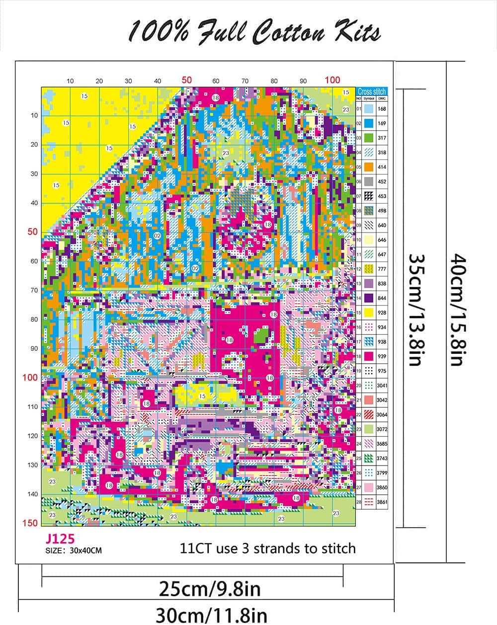 - Package:11.8*15.8inch, 2pc cross stitch needles, enough thread already sorted, English instructions,cross stitch patterns instructions,and 11CT Pre-printed stamped cross stitch fabric cloth. (11CT,without frame)
