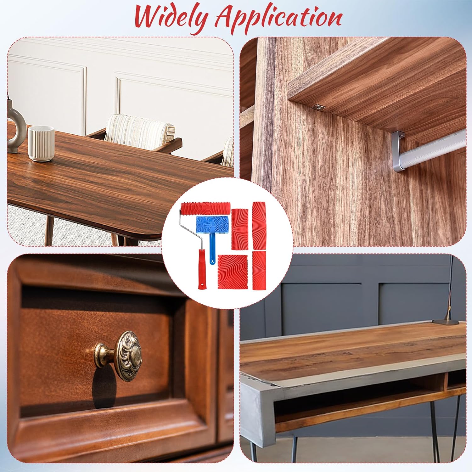 - Package Includes: You will receive 1 x wood pattern painting roller with handle; 1 x 4 inch wood graining rocker with handle; 4 x wood grain rubber tools. ( 3 inch, 4 inch, 5inch, 6 inch)