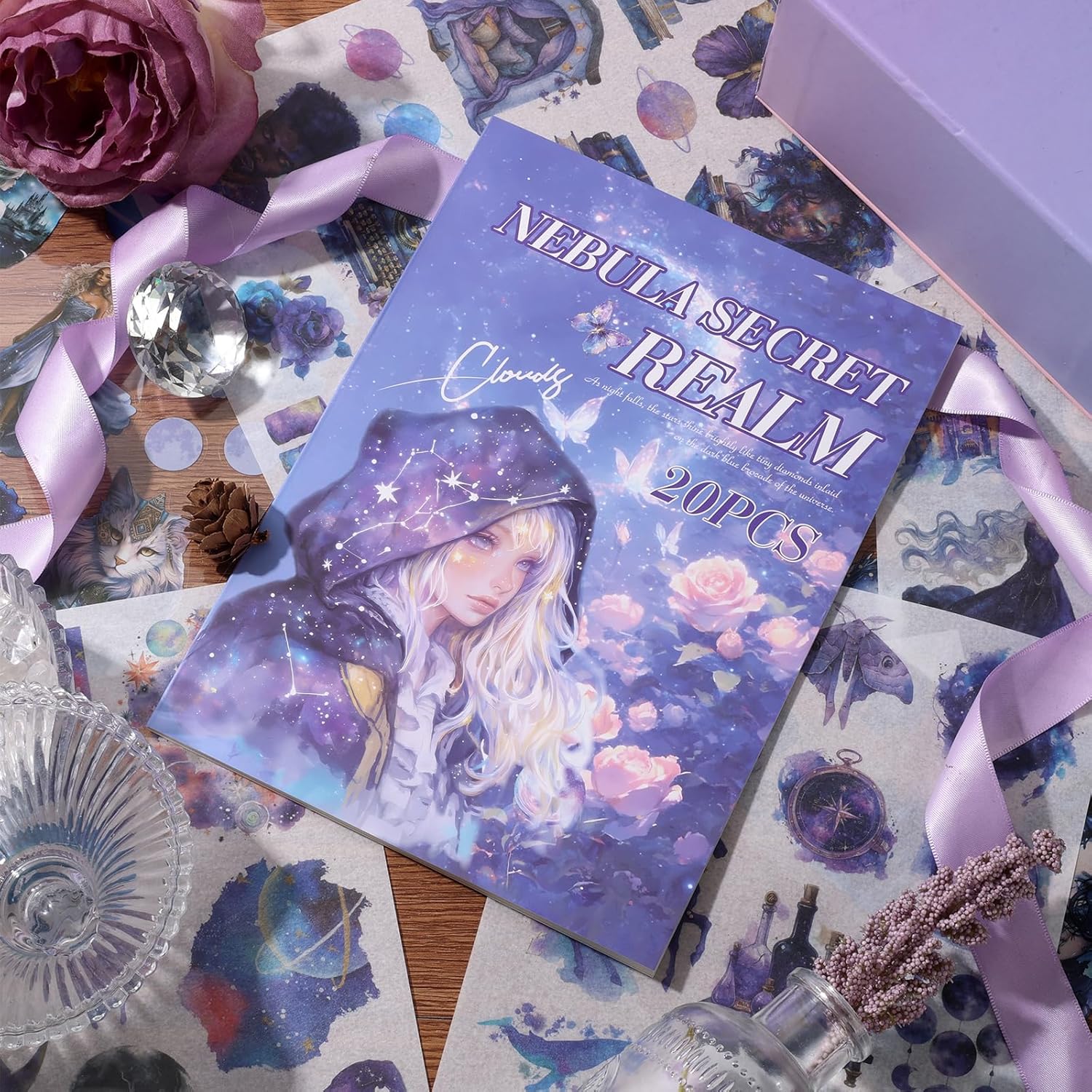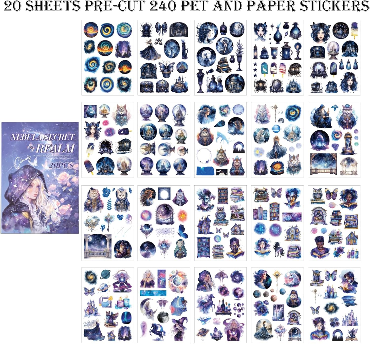 Fantasy Magic Scrapbook Stickers 20 Sheets 240 Pre-Cut Washi Stickers for Journaling PET Transparent Book Sticker Decorative or DIY Paper Crafts, Arts and Crafting Projects
