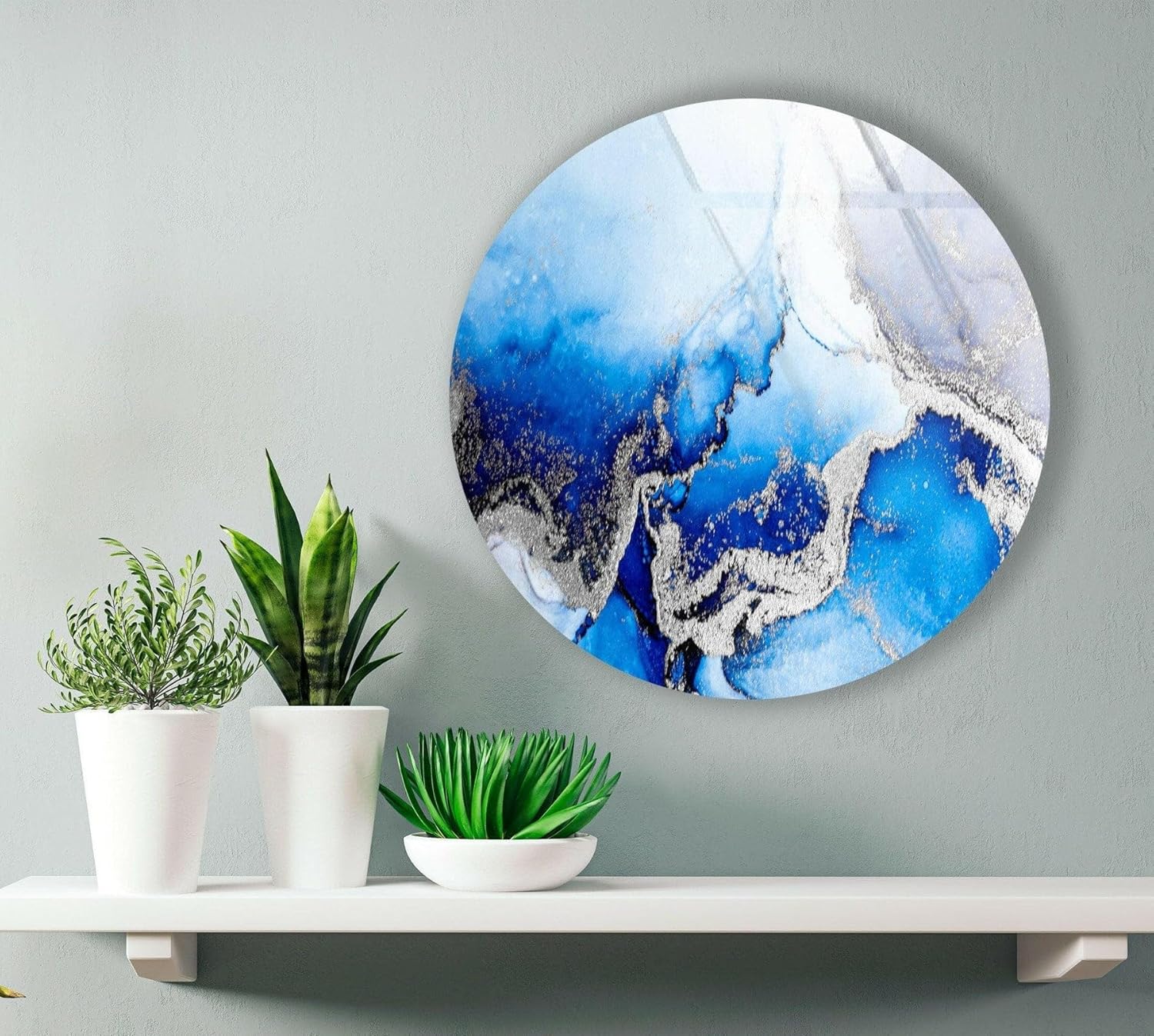 My Photostation.com 20''(50cm) Diameter Blue Marble Round with Silver Details Glass Wall Art Tempered Glass Printing Wall Decor Large Wall Art Wall Hangings
