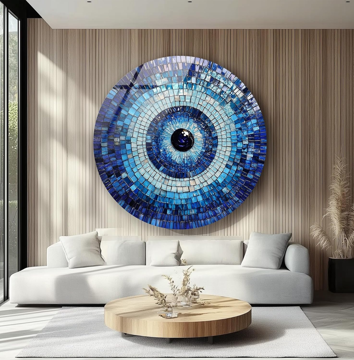 My Photostation.com 20''(50cm) Diameter Blue Mosaic Evil Eye Round Glass Wall Art Tempered Glass Printing Wall Decor Large Wall Art Wall Hangings