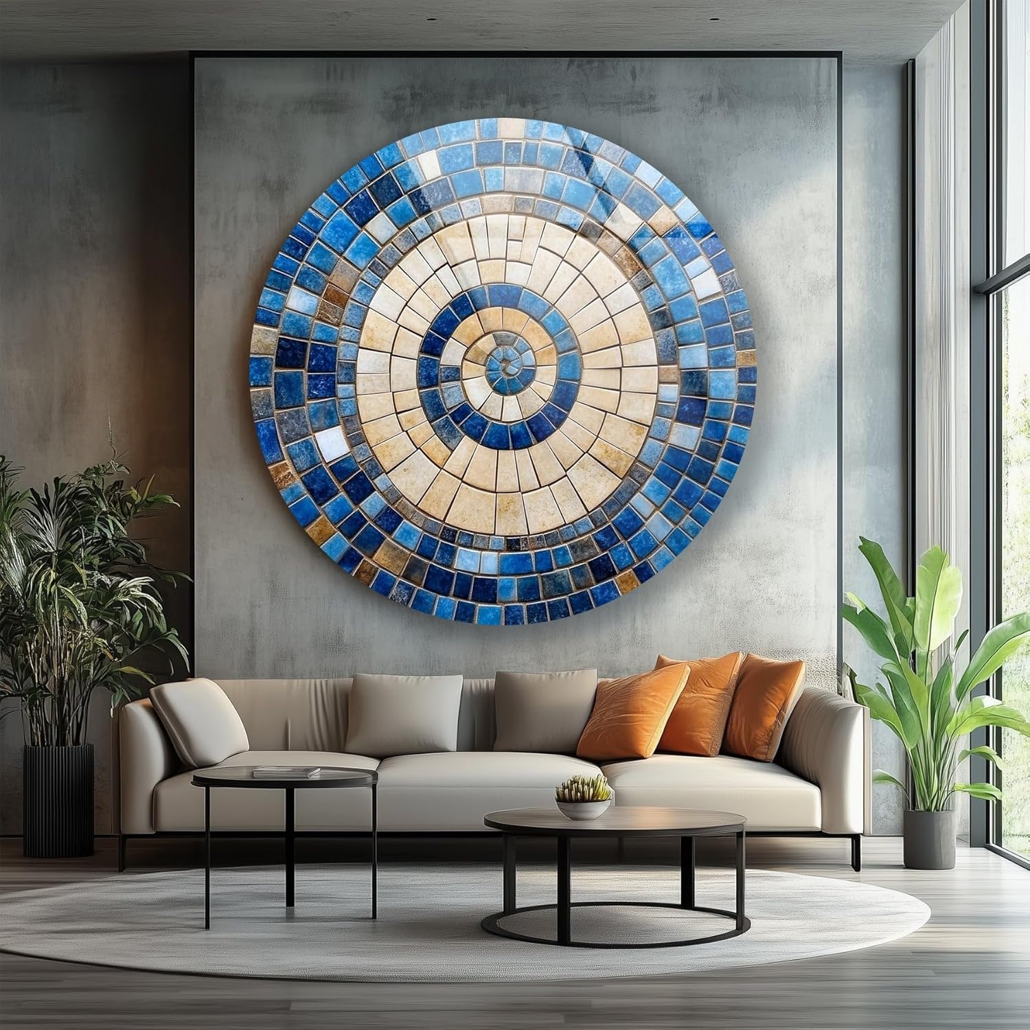 My Photostation.com 24''(60cm) Diameter Coastal Sunburst Beige & Blue Round Glass Wall Art Tempered Glass Printing Wall Decor Large Wall Art Wall Hangings