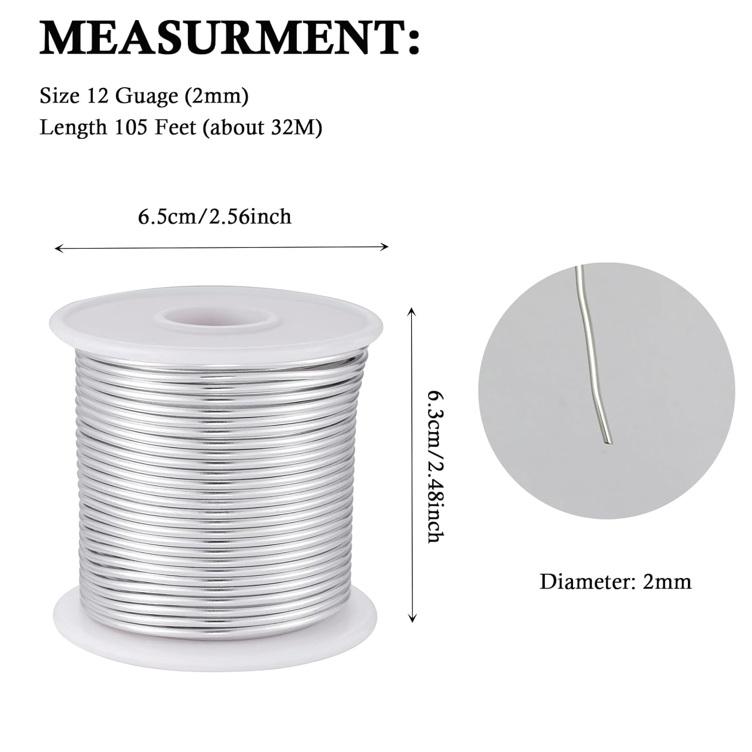 - Product size:The diameter of the aluminum wire is 2mm, the length of each roll is approx 105 feet(32m).This aluminum wire is a continuous strand and can be cut any length as you desire and used in various occasions, enough for craft making.Easy to bend but hold shape well