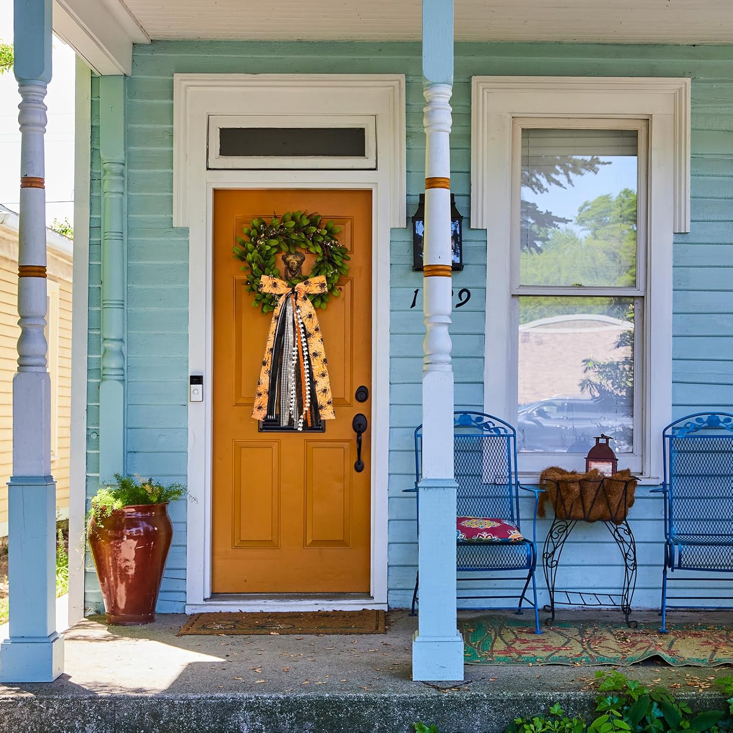 - Easy Hanging: Our large orange ribbon bow come equipped with a clip on the back, you can hang easily on windows, doors, wreaths, banisters, fences, trees, porch, garland, yard, posts, swags, mentals, and so on. Both outside decorating and inside decorating are suitable