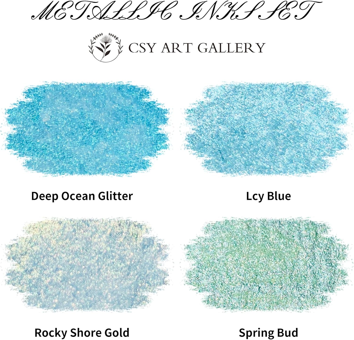 CSY art gallery Metallic Acrylic Ink-Craft Paint-Calligraphy Inks,Glitter-Pearlescent -ICY Blue Drawing Ink Liquid Gold Leaf Paints with Dropper, 1oz - 29.5 ml (Ice Lake Mountains Set)