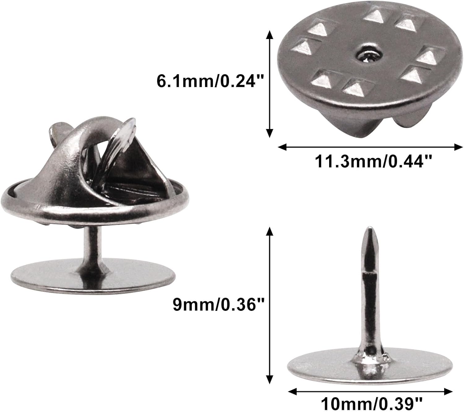 - Size: Metal clutch backs diameter 11.3mm/0.44", 6.1mm/0.24" in height; Pin backing diameter 10mm/0.39", 9mm/0.36" in height. Total 260set pin backs locking, meet your different uses for crafts.