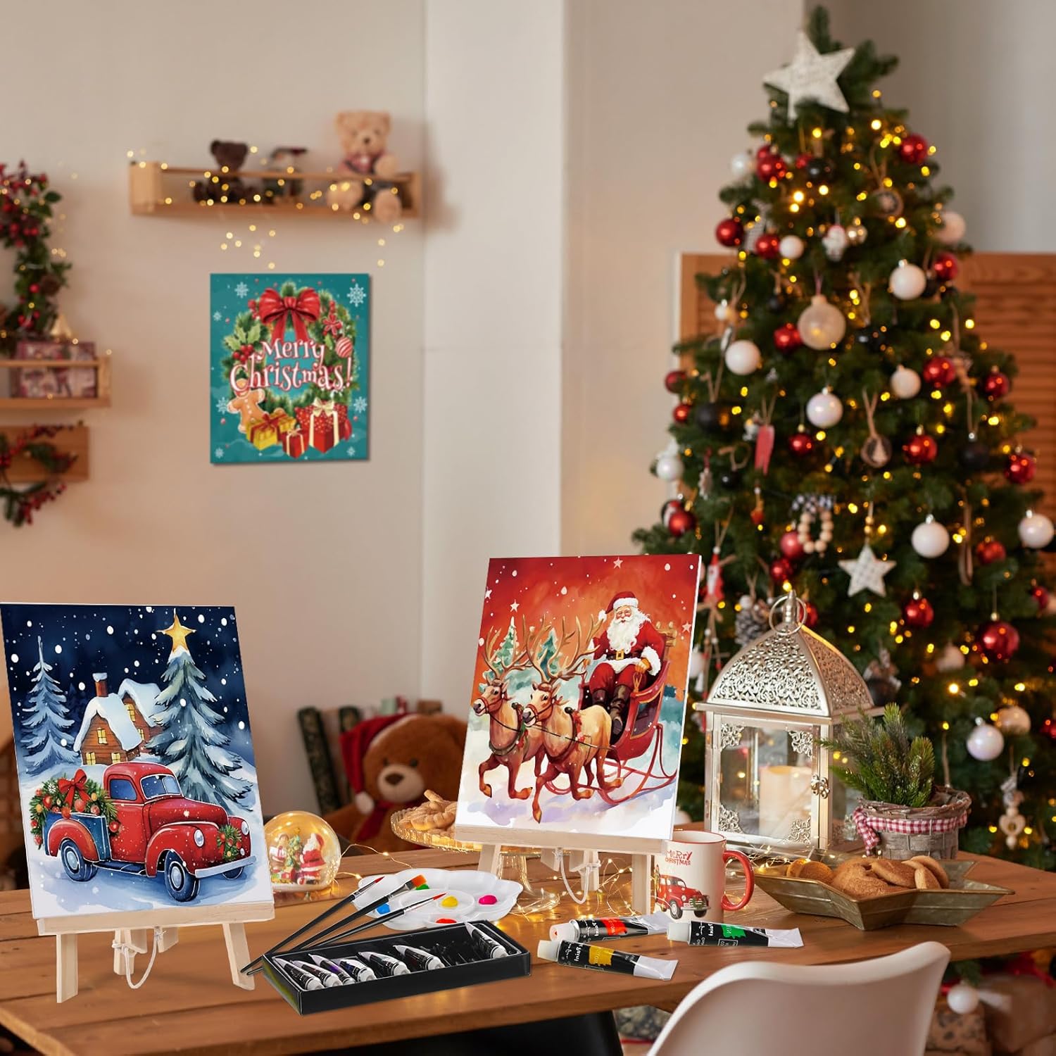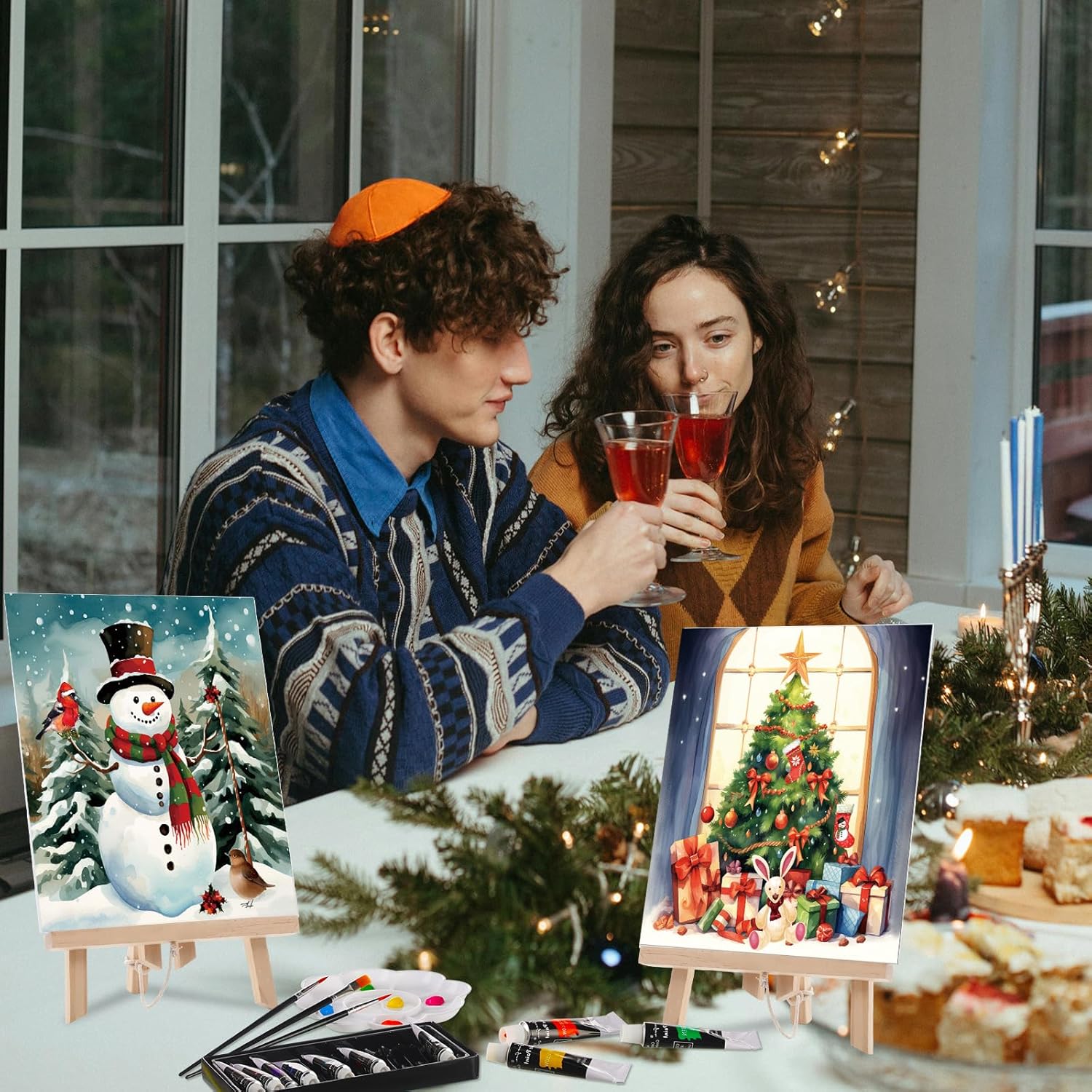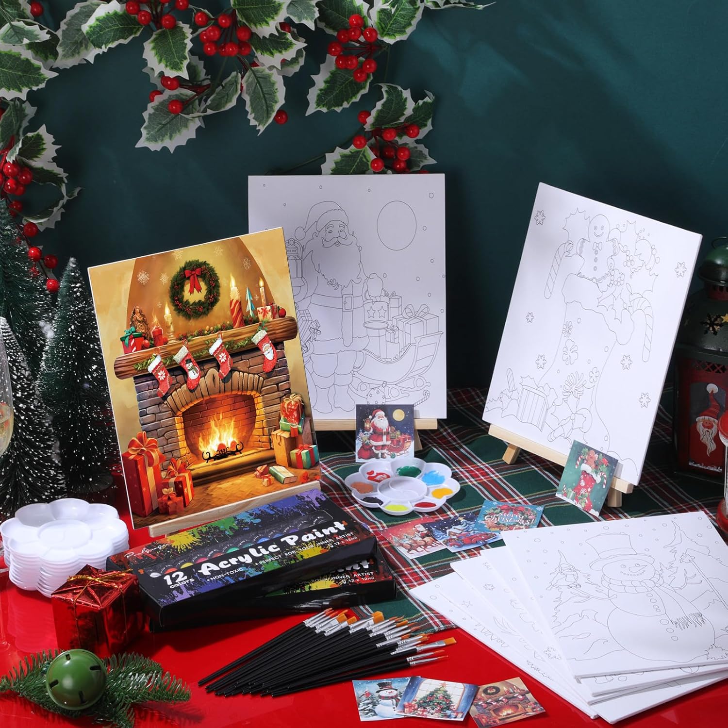 Cholemy 36 Pcs Paint and Sip Kit for Adults 8''x10'' Pre Drawn Canvas for Painting DIY Afro Acrylic Painting Kit Wood Easel Brushes Date Night Bulk for Christmas Party Gifts(Christmas A)