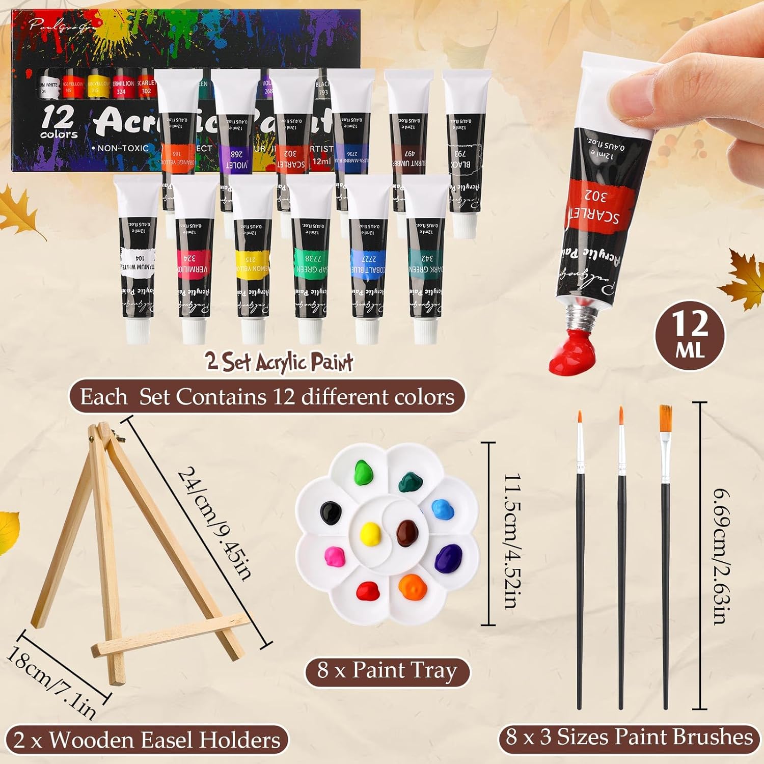 - Extensive Pre Printed Canvases Set: a total of 8 pre printed canvas, with 8 different well designed patterns; Comes with 12 color reference matching cards corresponding to the pattern; 2 packs of acrylic paint set, each pack contain 12 different colors; 2 pcs wooden easel holders; 8 packs of paintbrushes, 3 per pack, including 3 different pen and 8 pcs of white paint trays