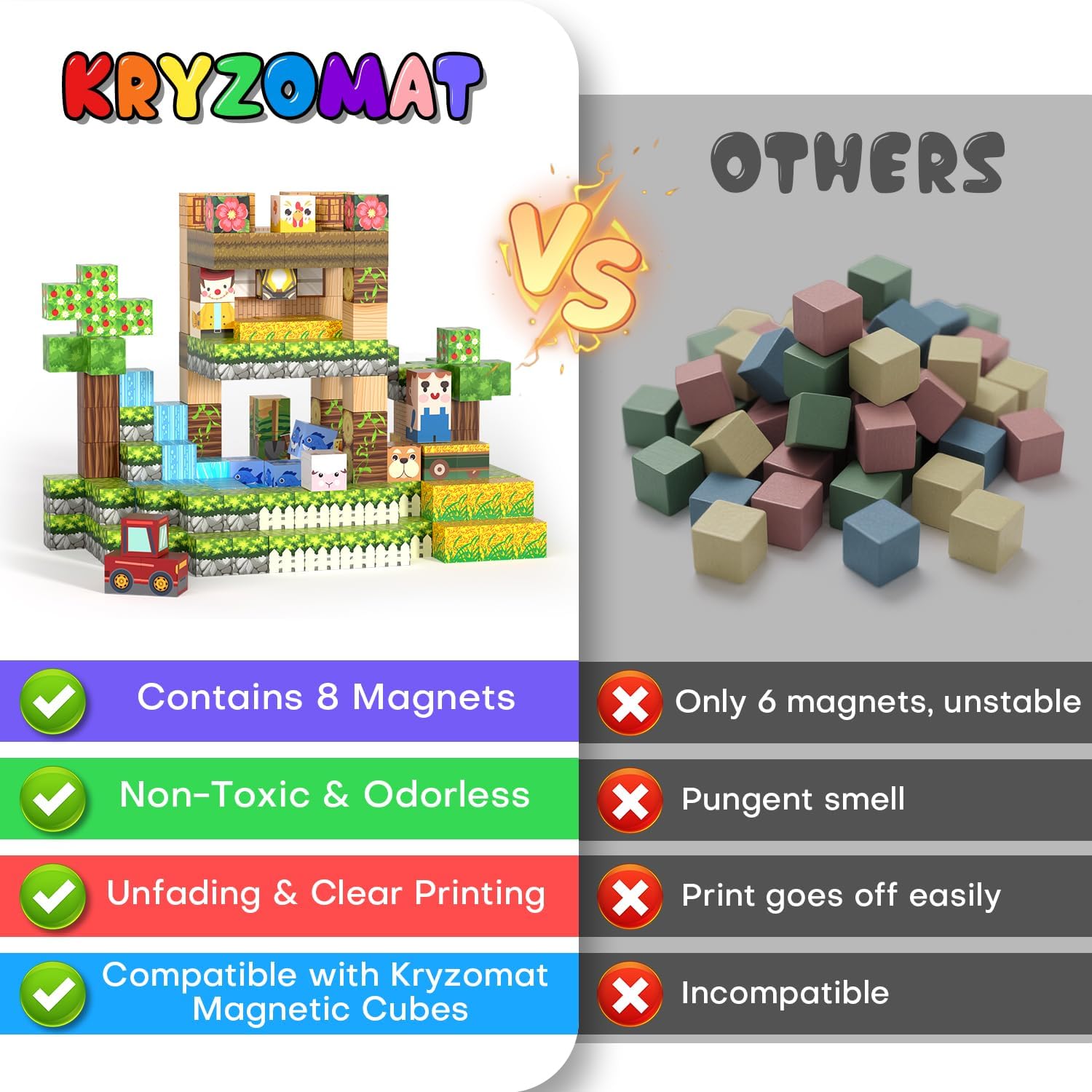 - Safe and Durable: Made from high-quality and non-toxic materials and smooth edges, very safe for small hands of children over 3 years old. These washable, safety-certified magnetic cubes are built to last. Kryzomat are dedicated to provide safe, educational and fun toys at the same time