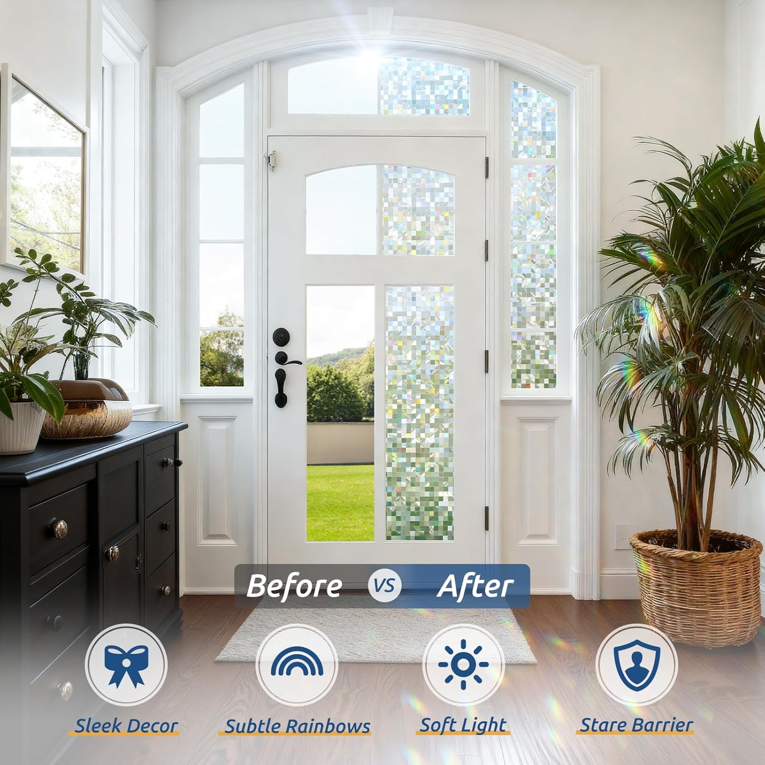 - Mosaic Art, Rainbow Light: Transform your space with light and privacy. Our mosaic window privacy film blends 3D glossy and frosted textures to create a stunning stained glass window film effect, projecting beautiful rainbow indoors. This unique decorative window film ensures all-day privacy while elevating your decor