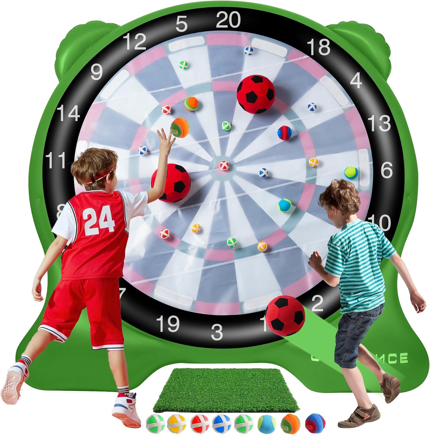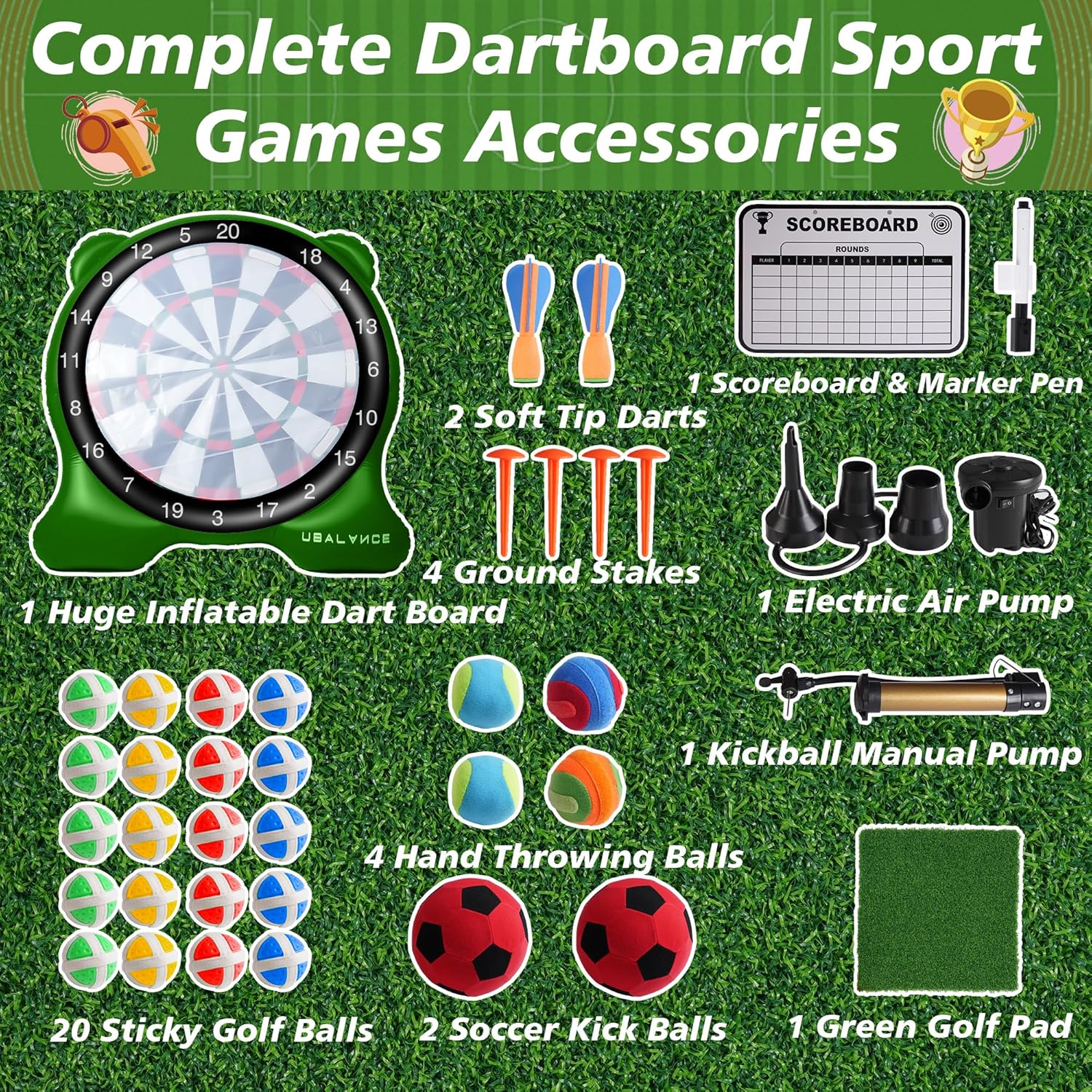 - Complete Dartboard Games Accessories: The dart board set includes 1 huge inflatable dart board, 1 electric air pump for dart board, 1 kickball pump, 20 sticky golf balls, 2 soccer kick balls, 4 hand throwing balls, 2 soft tip darts, 1 scoreboard & marker pen, 1 green golf pad, 1 adhesive board, 4 ground stakes, 1 storage bag, 1 manual, etc. complete set for funny yard games.