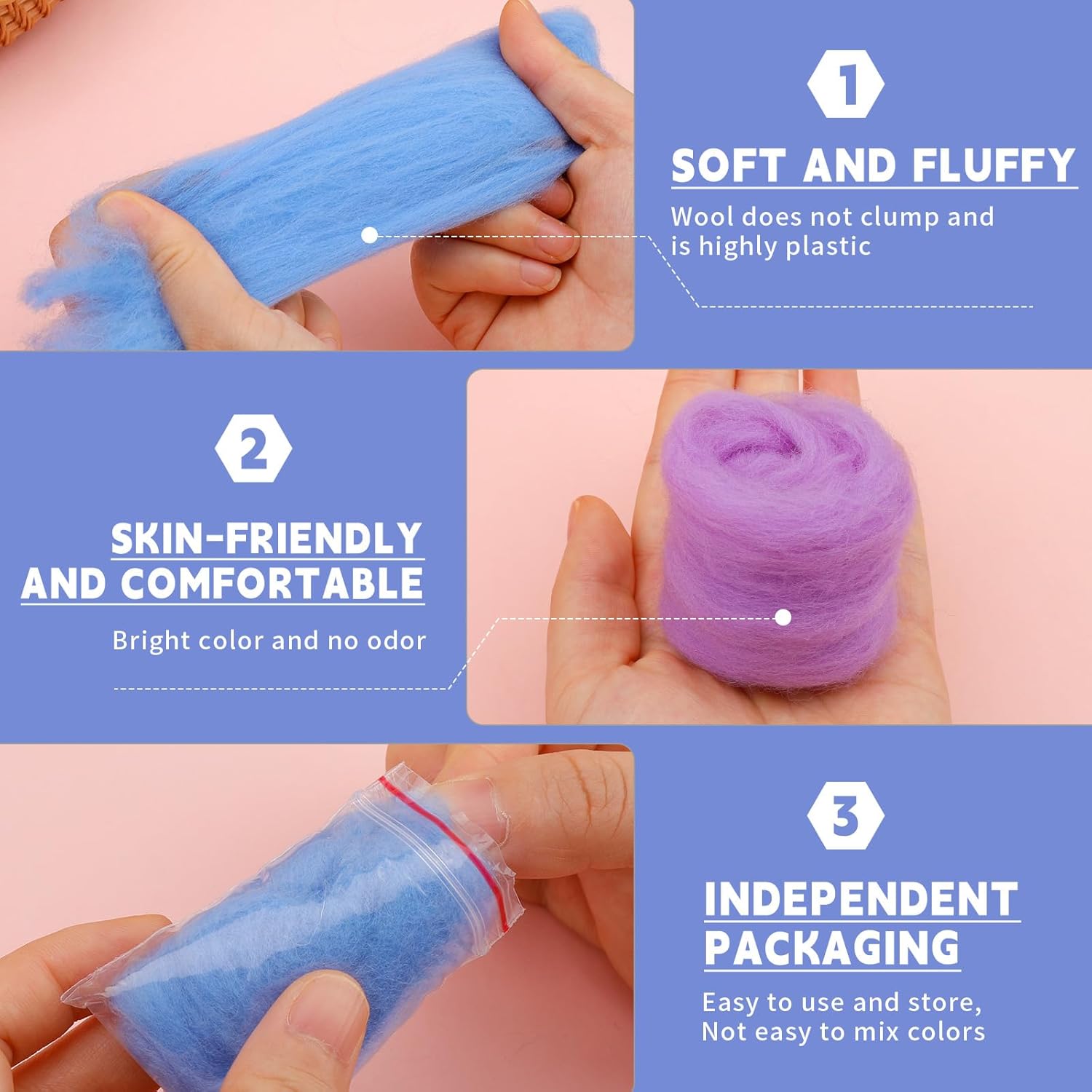 - Individually Packaged: Each wool roll comes with a separate, resealable bag, each bag contains approximately 3 grams. This prevents the wool from becoming loose and the colors from being mixed up, making it easier for you to find the color you want