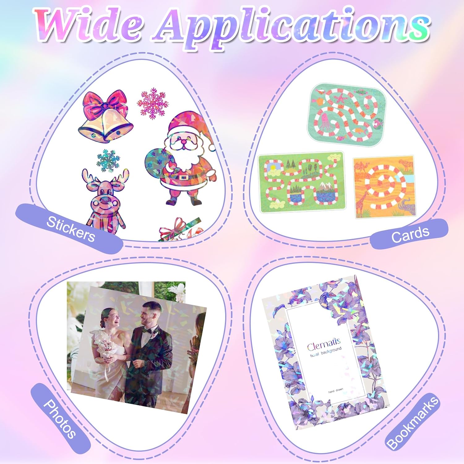 - 【Versatile Applications】 Our holographic sticker is perfect for a variety of creative projects, including home decor, scrapbooking, greeting cards, decals, notebooks, and more. Waterproof sticker papers' adhesive properties allow them to adhere smoothly to a variety of surfaces, including paper, plastic, glass, and metal. This versatility makes it an excellent choice for artists, hobbyists, and DIY enthusiasts.