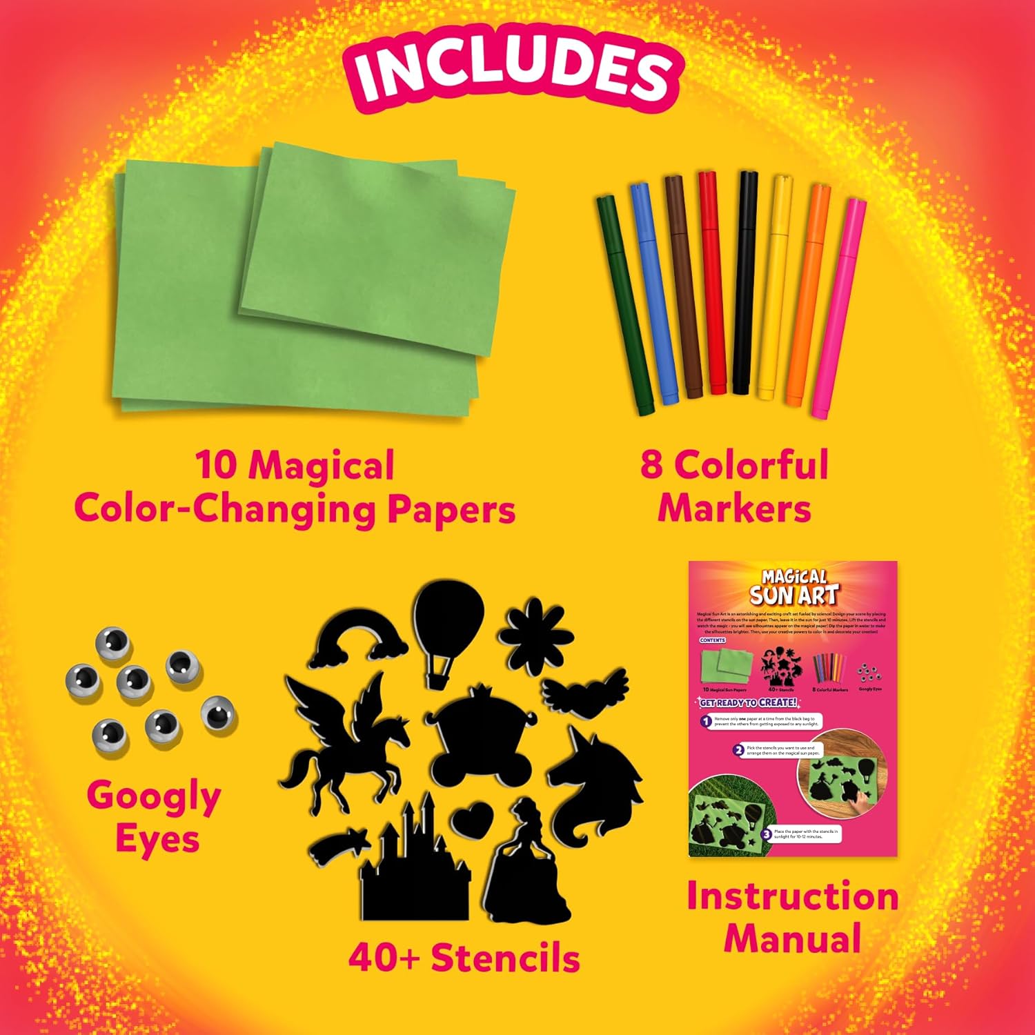 - INCLUDES: 40+ Stencils (Unicorns, Princesses & More!), 6 Large Magical Sun Papers, 4 Small Magical Sun Papers, 8 Colorful Markers, Googly Eyes & an Instruction Manual.