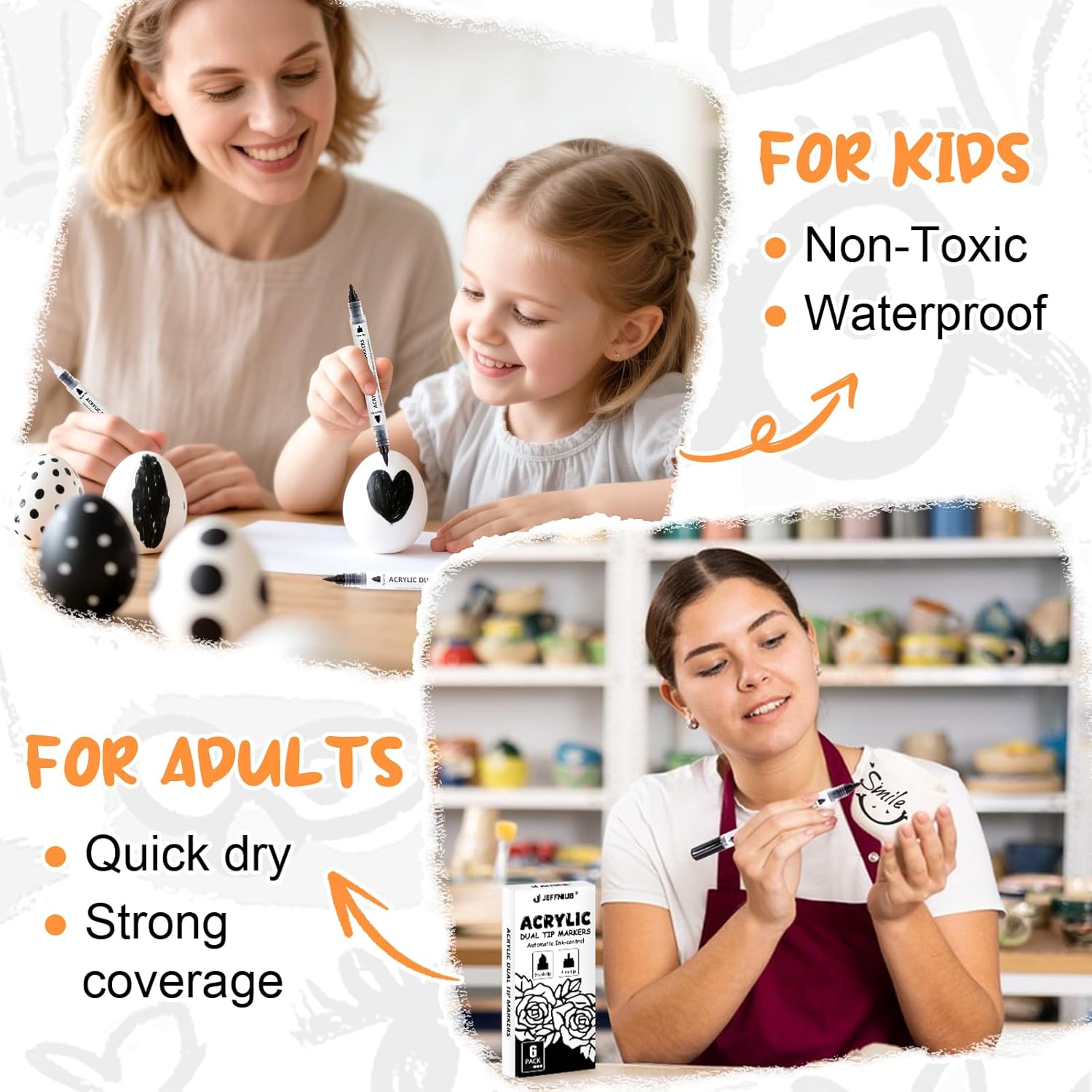 - Multi-Surface Use: The 2 classic colors (Black/White) make them perfect for most projects. High-quality acrylic paint marker for stones, wood, canvas, metal, leather, paper, unglazed pottery, and fabric. Delivers a durable, opaque, and glossy finish on both light and dark surfaces.