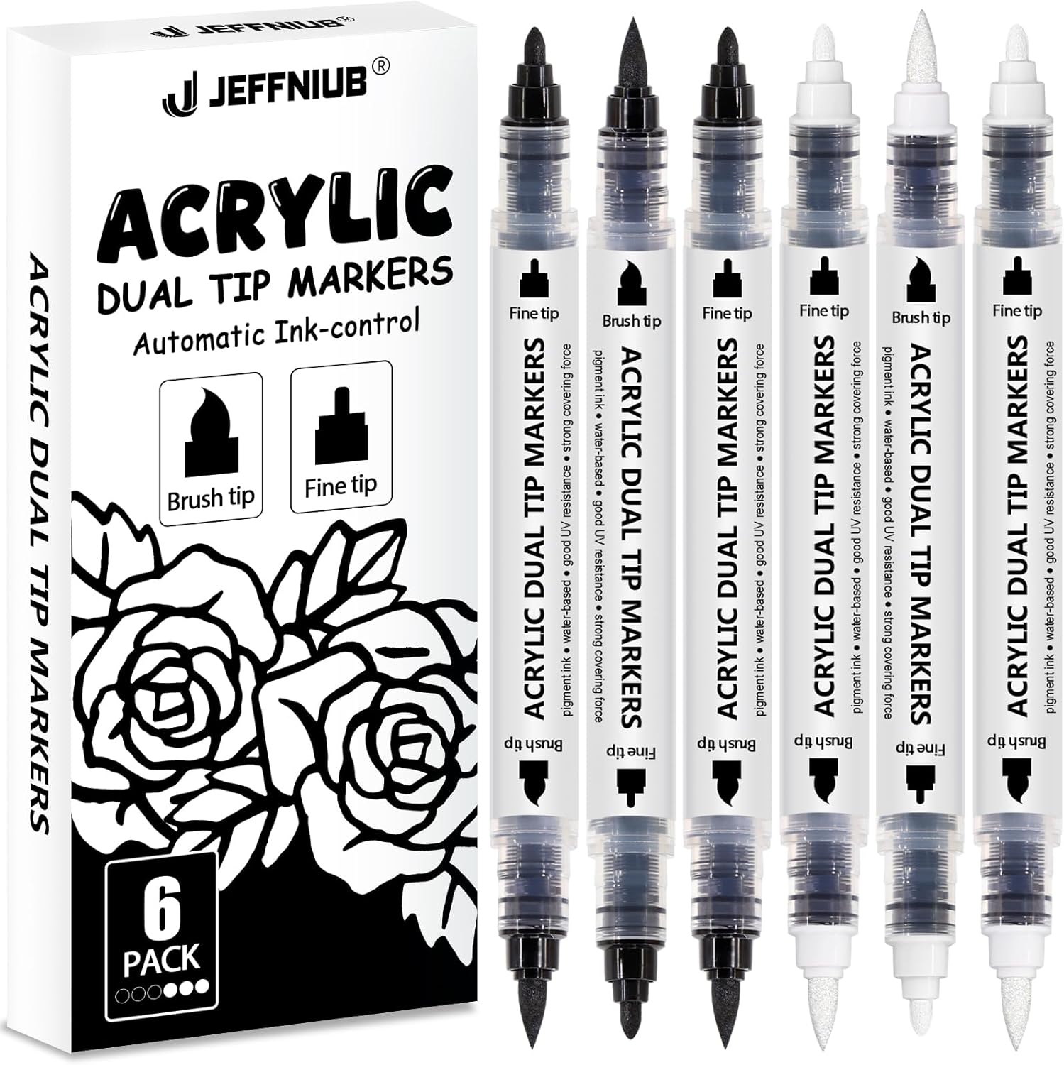 Black White Acrylic Paint Pen Brush, 6PCS Dual Tip Automatic Ink-control Acrylic Markers for Rocks, Metal, Glass, Wood, Fabric, Porcelain, Ceramic