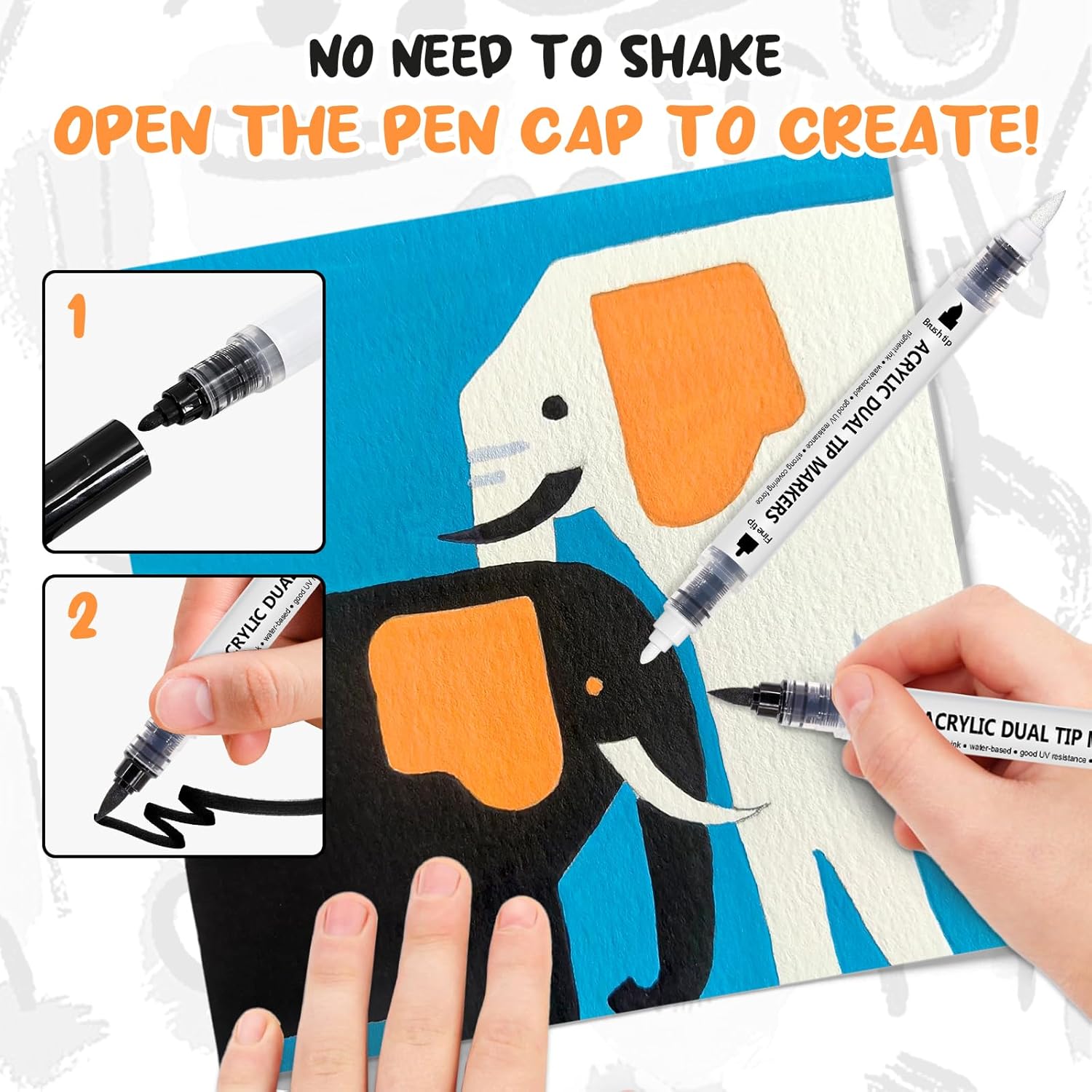 - Dual-Tip Automatic Ink-control Design: Each marker comes with two nibs—a precise 1-2mm fine tip for intricate details and a flexible 0.5-5mm brush tip for broad strokes. Switch effortlessly between fine lines and bold coverage, enhancing both versatility and efficiency. You don't need to press the pen tips, just open the cap and use it.