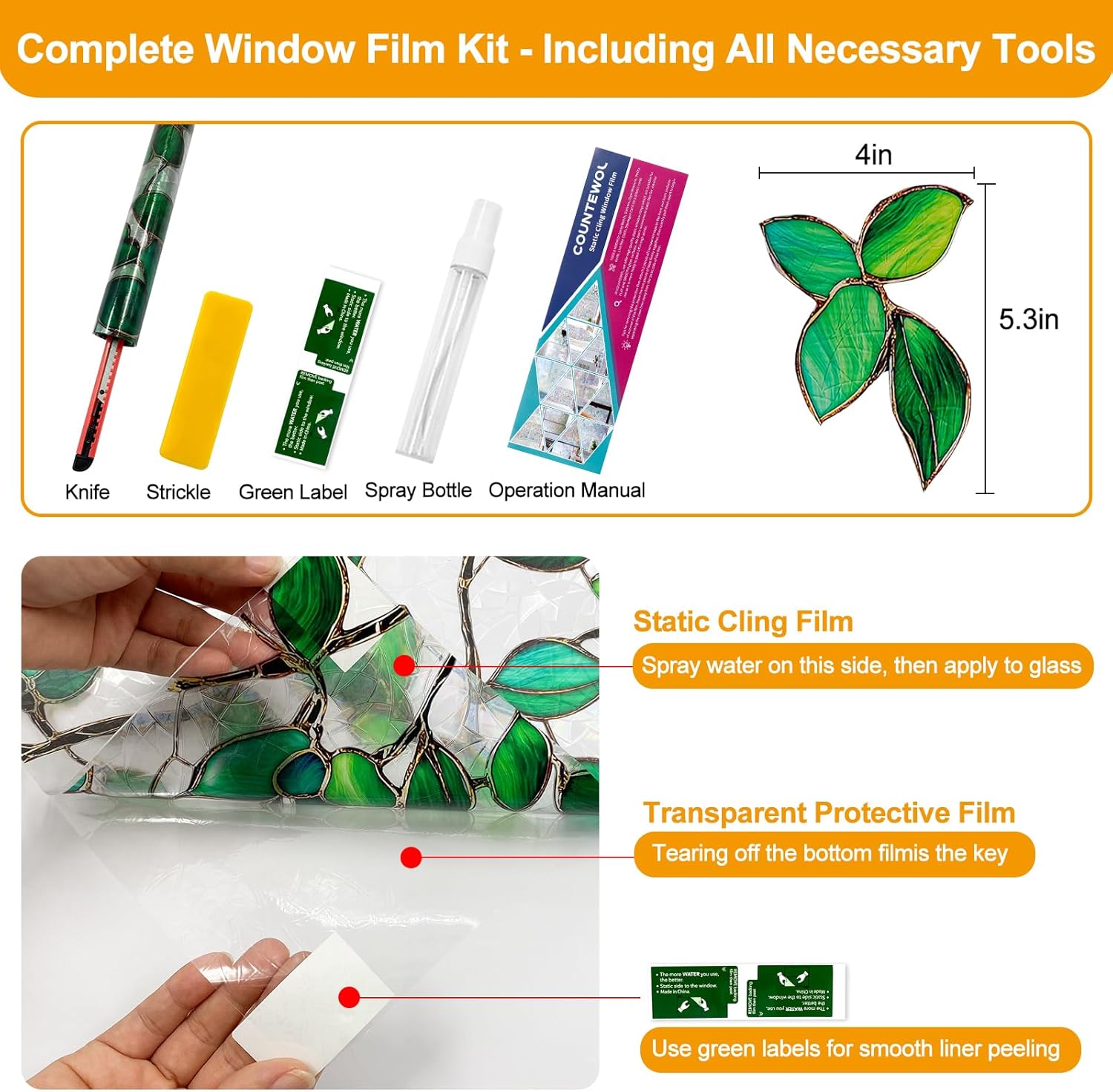 - DECORATIVE DESIGN: These window films feature a beautiful green leaf pattern that adds a natural freshness to any room and creates a rainbow visual effect when the sun shines.
