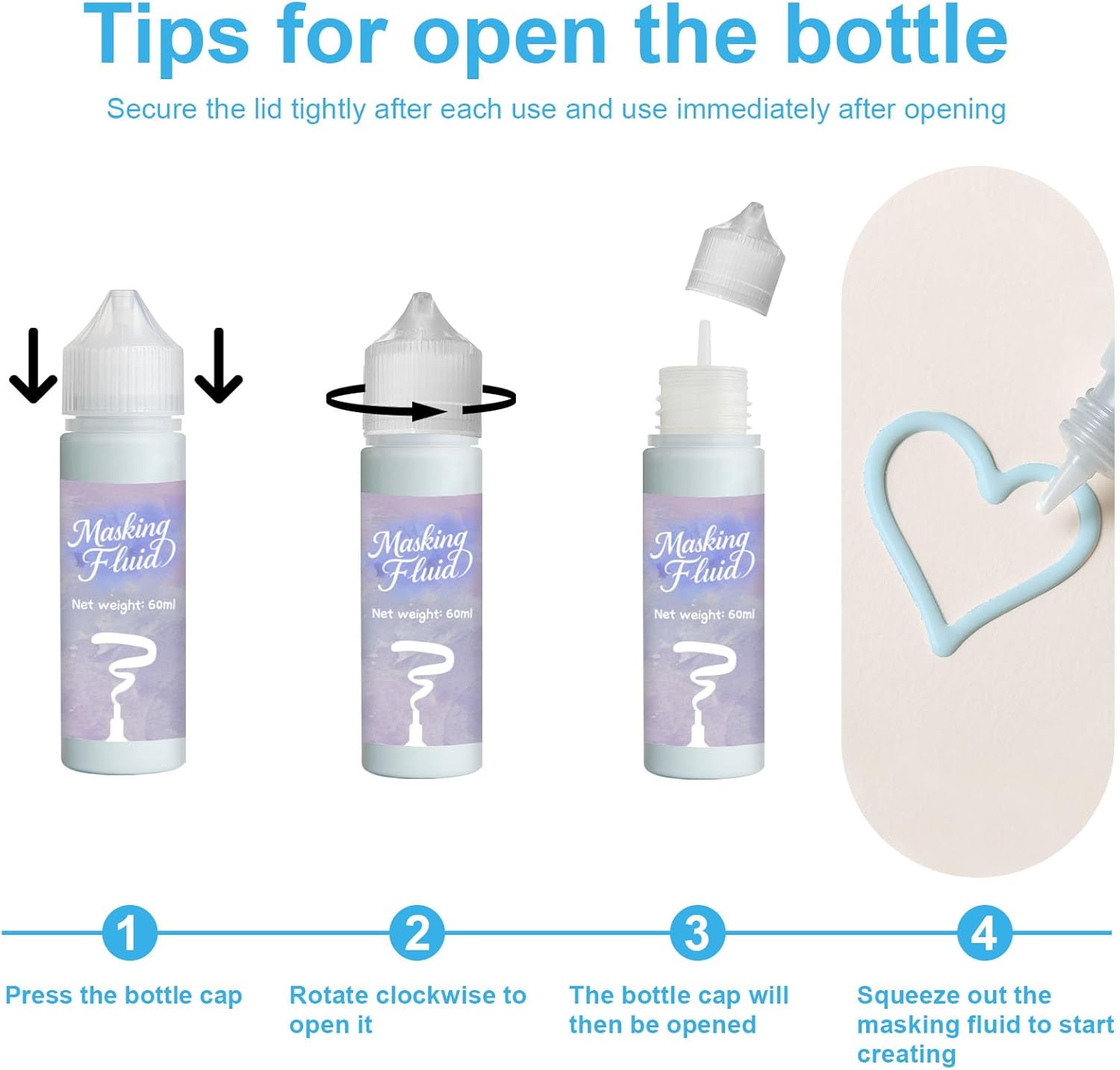 - Easy to Remove: The masking fluid comes with a brush and eraser. Use our brush to easily apply the liquid masking fluid. Once the masking liquid is completely dry, erase it with your finger or an eraser to reveal the clear areas and fine details. Once dry, it peels off easily without breaking or leaving residue, and it won't damage the paper.